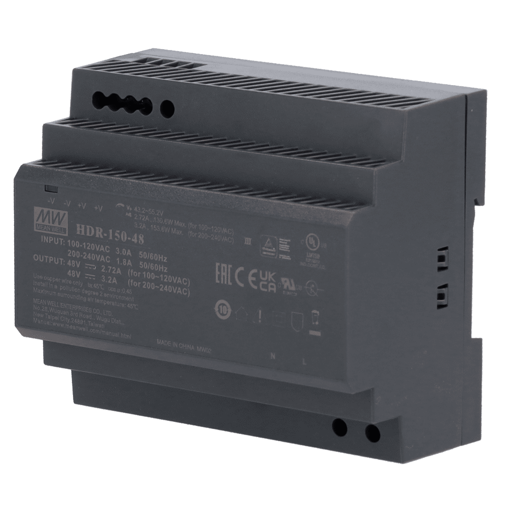 Fonte de alimentação – Saída CC 48 V / 3.2 A / 150 W – 2 saídas – 178 (Lg) x 97 (Al) x 38 (Pf) mm – Montagem em carril DIN – Específica para videoporteiros