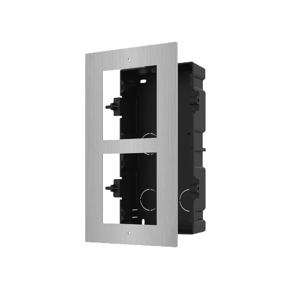 Painel frontal e caixa de registro encastrada – Até 2 módulos – Específico para video porteiros Hikvision – Compatível com os módulos Hikvision – Caixa de plástico – Painel fabricado em aço inoxidável