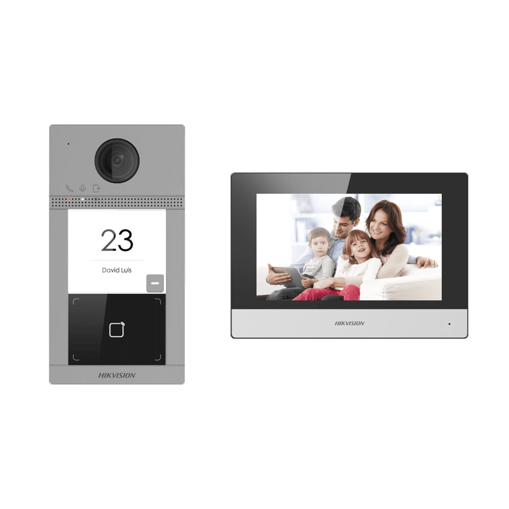 Kit de videoporteiro com dois relés – Tecnologia IP & WiFi – Placa e monitor | Permite 16 monitores mais – Leitor MF | PoE – Aplicação móvel com P2P | Relés internos no monitor – Montagem à superfície IP65, IK08
