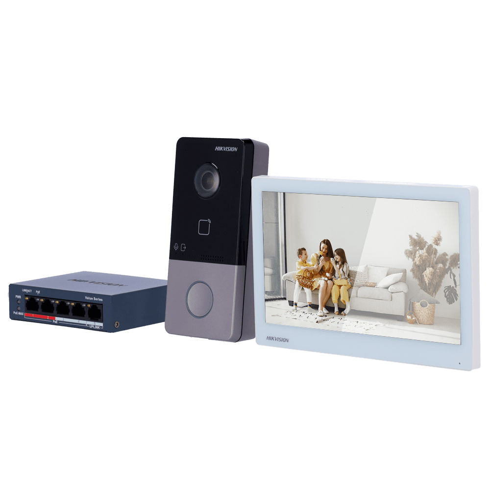 Kit de videoporteiro – Tecnologia IP e WiFi | Switch PoE – Placa e monitor | Permite 16 monitores mais – Leitor MF | PoE – Aplicação móvel P2P (ativação a partir do wizard monitor) – Montagem à superfície | IP65