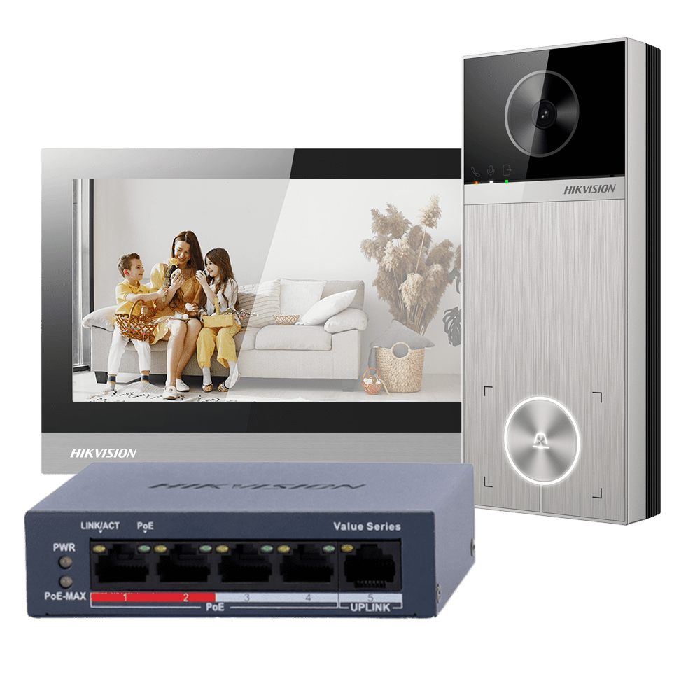Kit de videoporteiro 4 Mpx – Tecnologia IP e WiFi | Switch PoE – Placa e monitor | Permite 16 monitores mais – Bluetooth | PoE – Aplicação móvel com P2P | Relés internos no monitor – Montagem à superfície | IP65