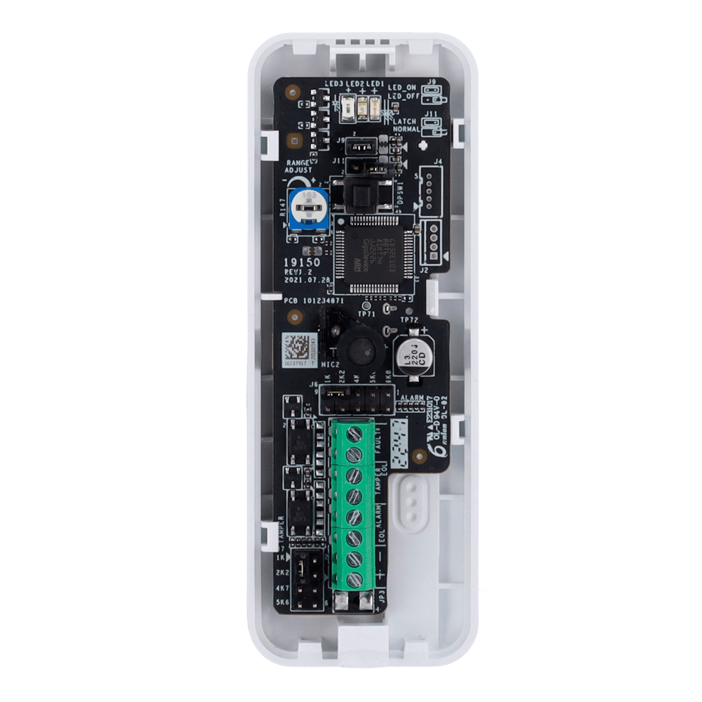 Detetor de quebra de vidro com fios – Gama de deteção 8 m / 120 ° – Alimentação 9~ 16 VDC – Resistências EOL selecionáveis – Uso interior – Certificado Grau 2