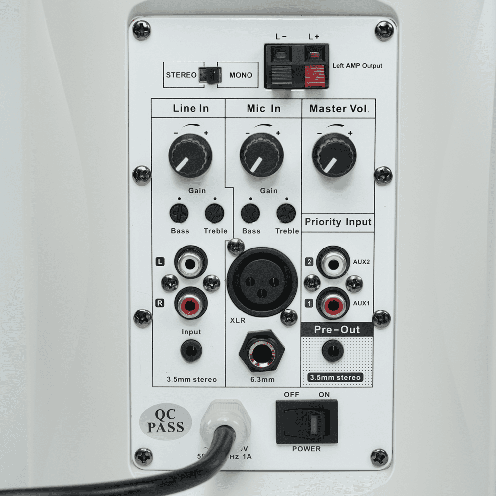 | Entradas / Saídas | – 3 x RCA (Line IN, AUX1 e AUX2) – 2 x 3.5mm (Line IN e PRE-OUT) – 1 x XLR (MIC IN) – 1 x 6.3mm (MIC IN) – 2 x Blocos de terminais (amplificação do canal esquerdo) |