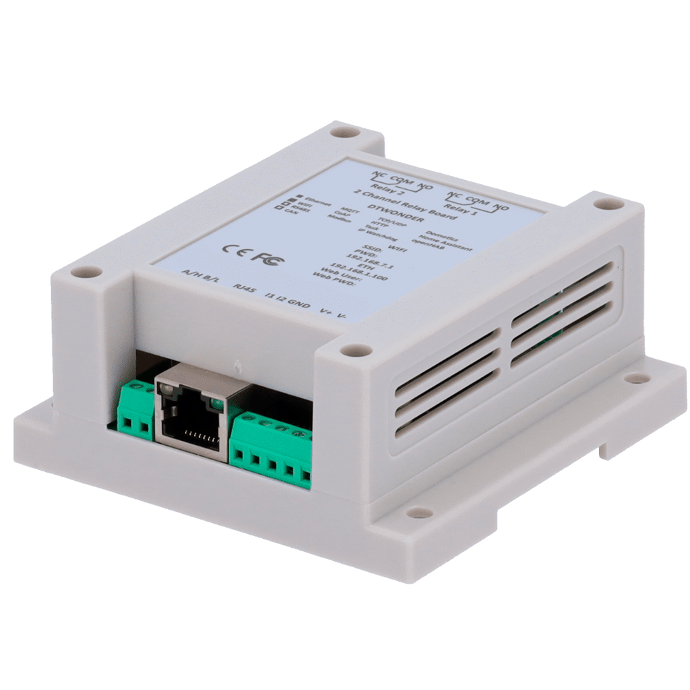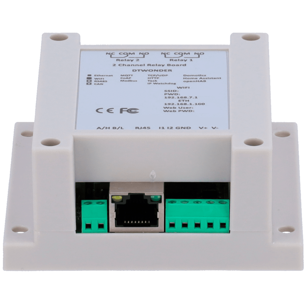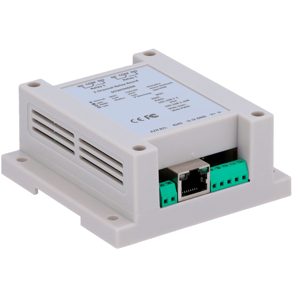 Módulo de aquisição e controlo de dados – 2 entradas digitais | 2 saídas de relé (NA/NF) – Protocolos: Modbus/TCP, TCP/IP, UDP, HTTP,… – Servidor web integrado – Porta Ethernet 10/100 Base-TX | Porta WiFi – Alimentador não incluído (12VDC/1A)
