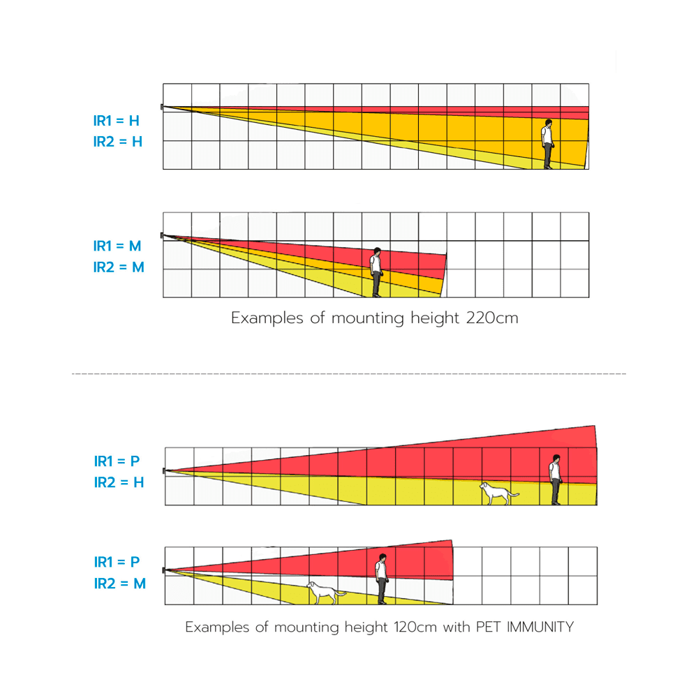 | Configuração no detetor (LEDs e botões) | Sensibilidade / Anti-masking / Tamper anti sabotagem/ Altura de montagem / Imunidade dos animais / Intervalo de deteção (mais informação pág. 9 manual na secção de download) |