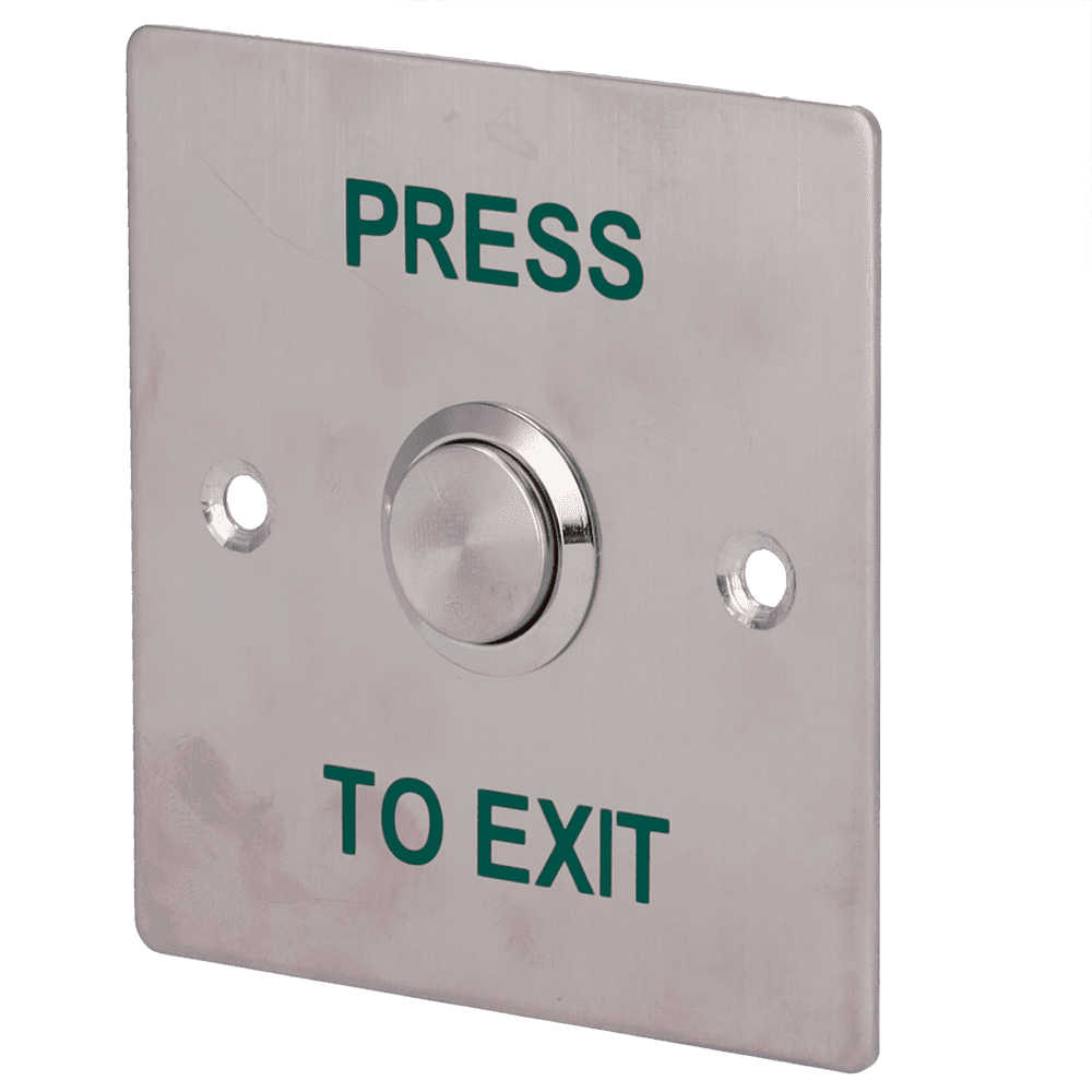 Botão de libertação de porta – Uso profissional – Testado 500.000 utilizações – NO/NC/COM | Montagem embutida ou de superfície – Dimensões 86 (A) x 86 (L) x 29 (P) mm – Fabricado em aço inoxidável