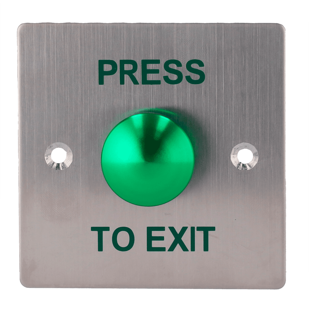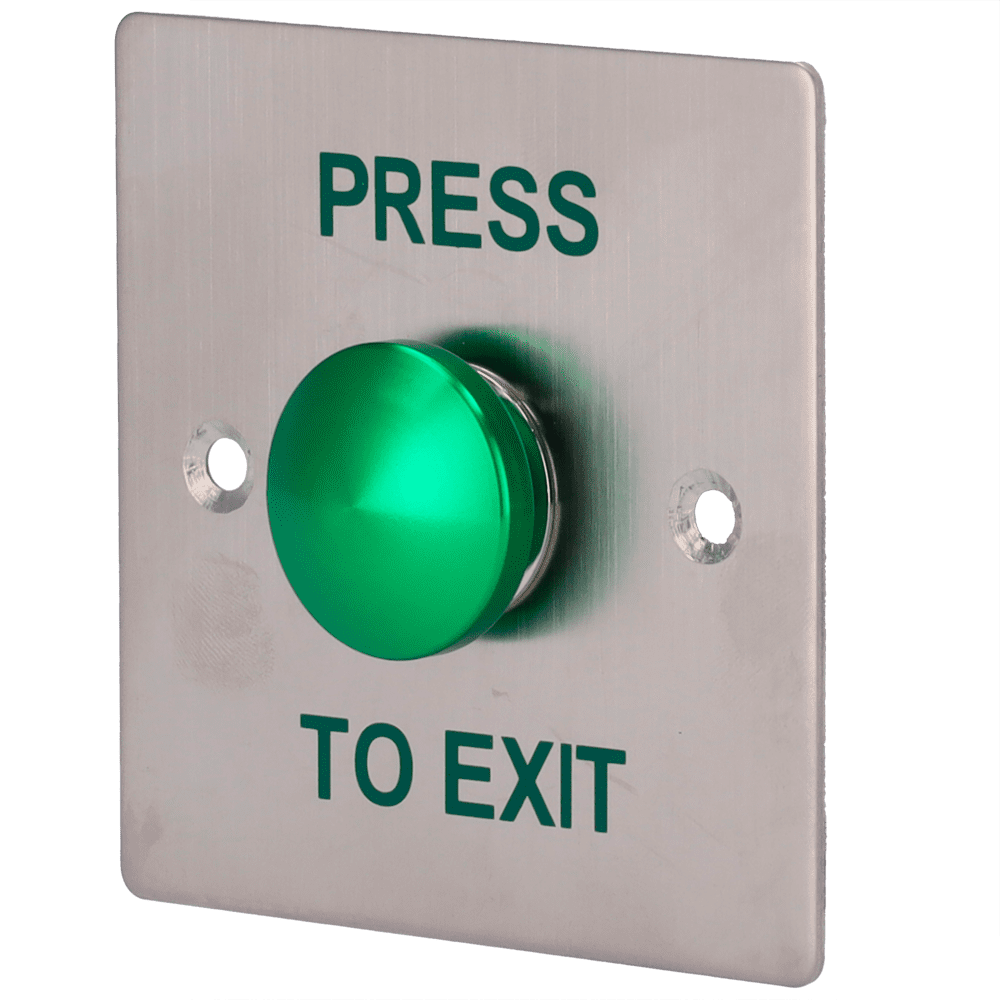 Botão de libertação de porta – Tipo semiesfera – Testado 500.000 utilizações – NA/CF | Embutido ou à superfície – Dimensões 86 (A) x 86 (L) x 23 (P) mm – Fabricado em aço inoxidável