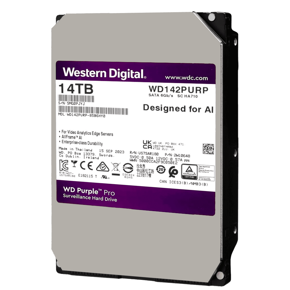 Disco rígido Western Digital PRO – Capacidade 14 TB – Interface SATA até 255 MB/s – Modelo WD142PURP – Concebido para soluções DeepLearning – Suporta até 32 transmissões de IA