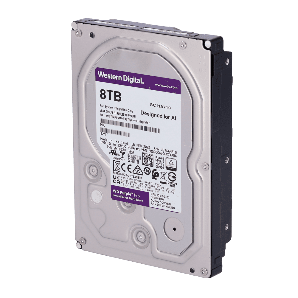 Disco rígido Western Digital PRO – Capacidade 8 TB – Interface SATA até 267 MB/s – Modelo WD8002PURP – Concebido para soluções DeepLearning – Suporta até 32 transmissões de IA