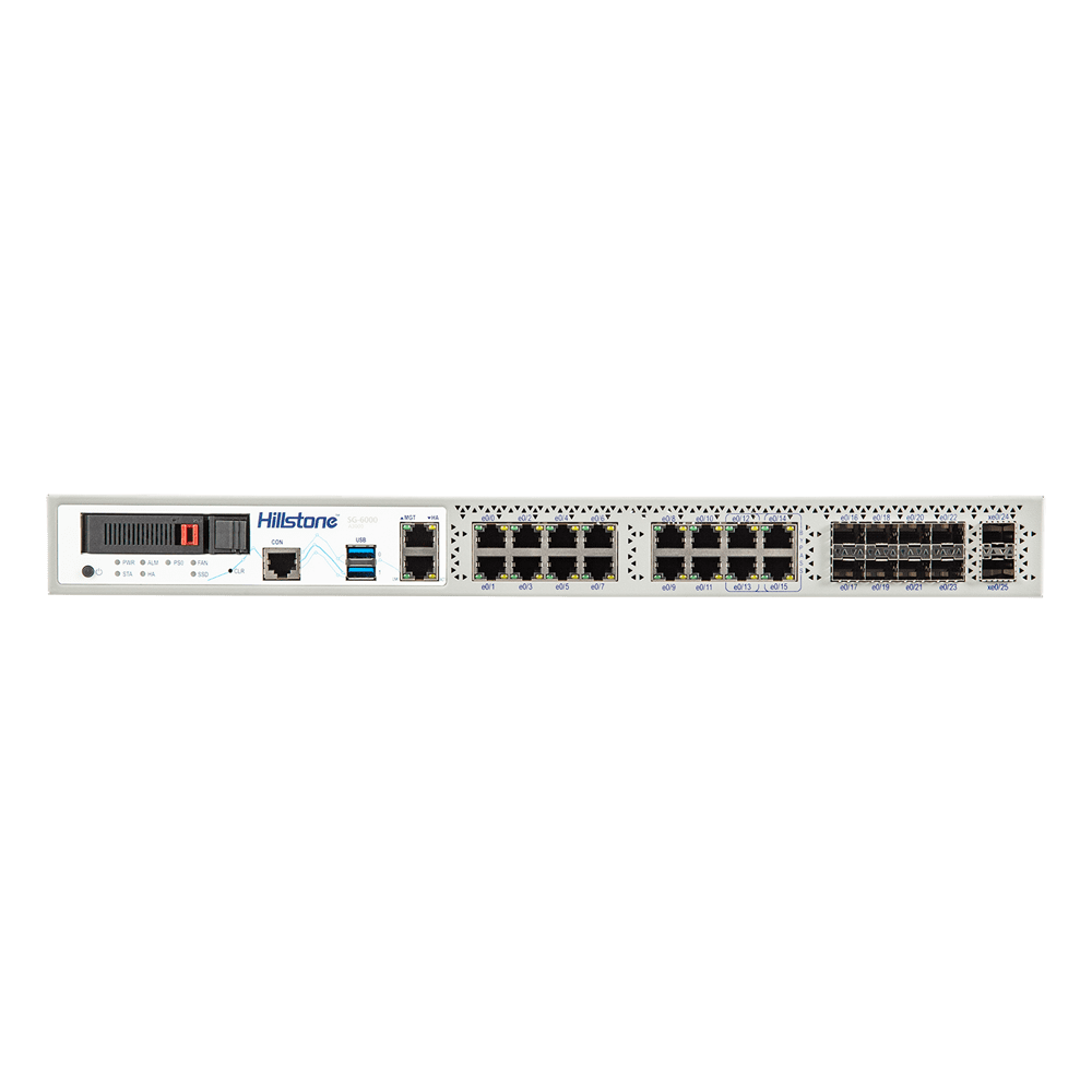 Hillstone Networks NGFW – Hardware + 1 año de servicio básico – 20Gbps FW/6.5Gbps NGFW Throughput – 3M Sesiones Concurrentes – 16×GE (2 bypass) + 8×SFP + 2×SFP+ – Rack 1U / Expansión hasta 1.92Tb