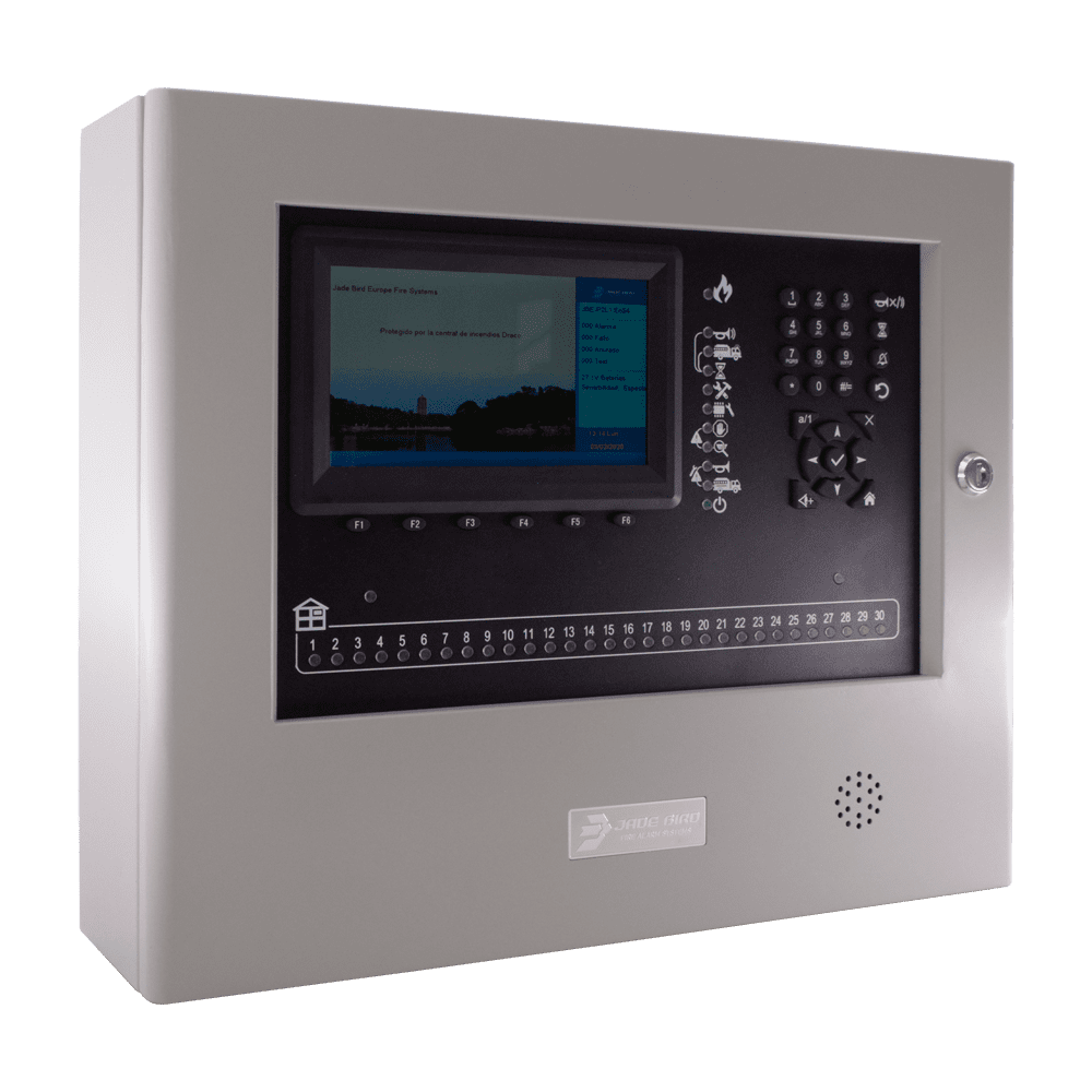 Central analógica Jade Bird de 4 laços expansível – Até 8 ligações com JBE-P2L2-2LP e JBE-EXP – Até 200 dispositivos por laço – USB para programação e atualização de dados – Visor LCD a cores de 7 – Certificados EN54-2, EN54-4