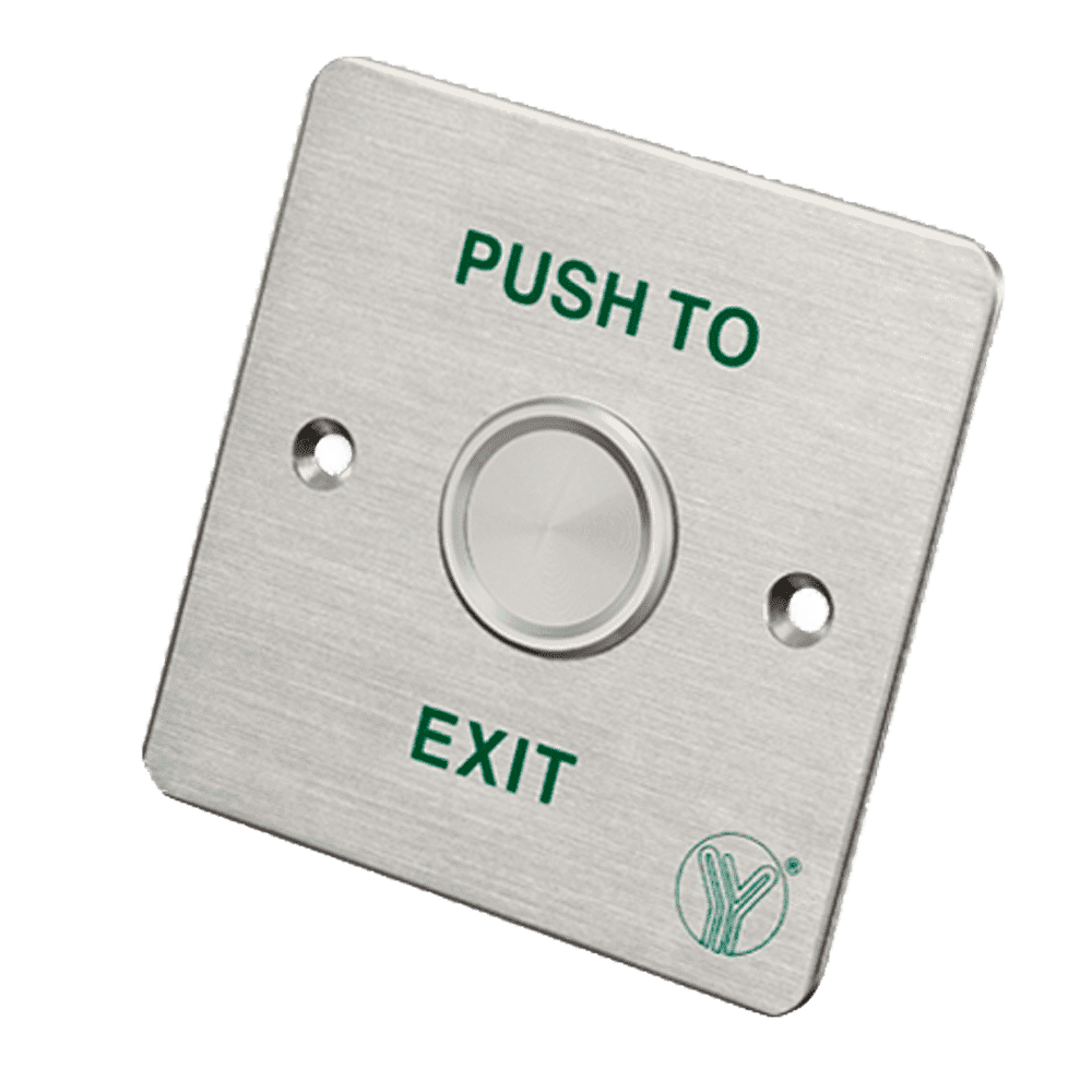 Botão de saída – Tipo piezoelétrico – Apto para exterior IP68 – NO/COM | Embutido ou montado à superfície – Dimensões 86 (A) x 86 (L) x 20 (P) mm – Fabricado em aço inoxidável