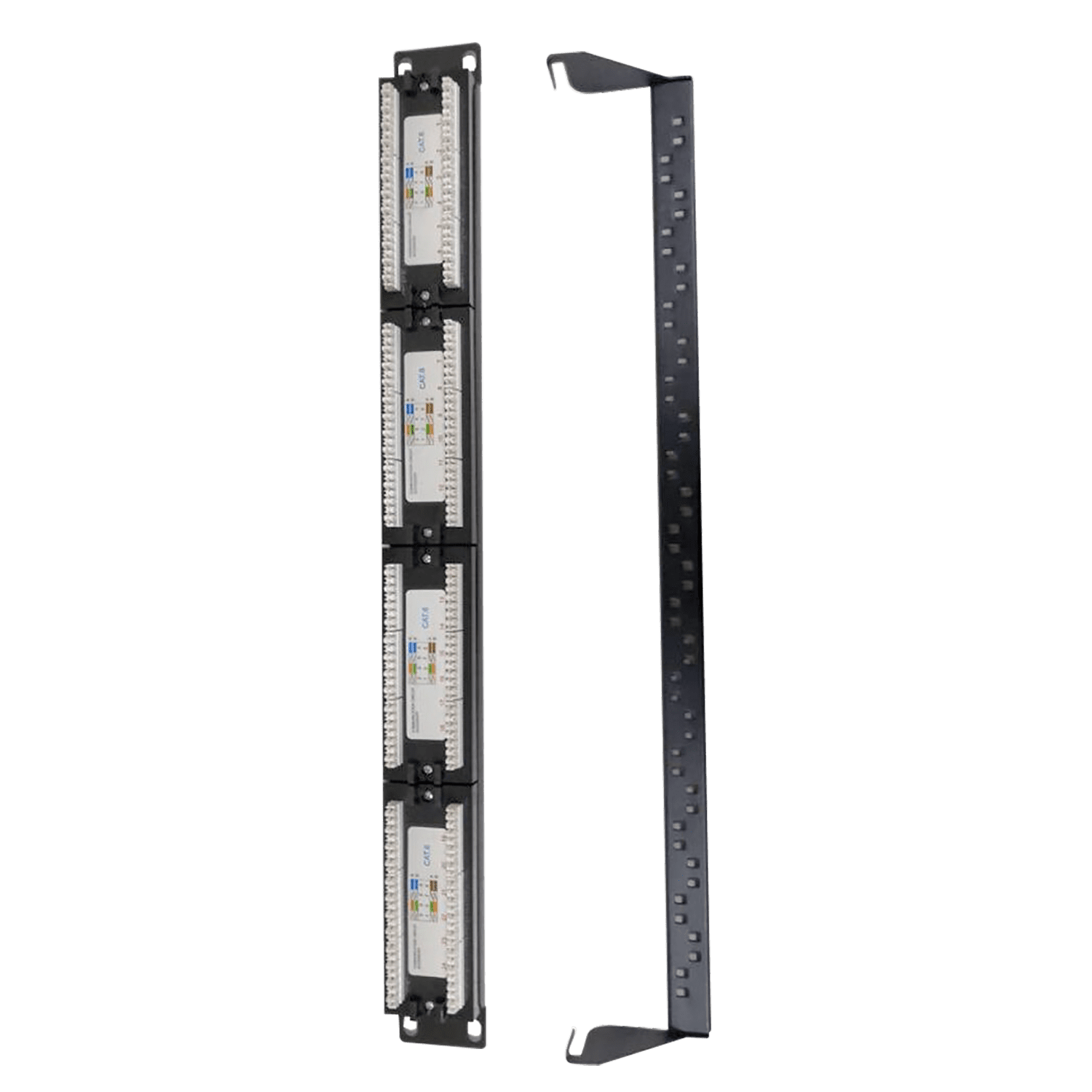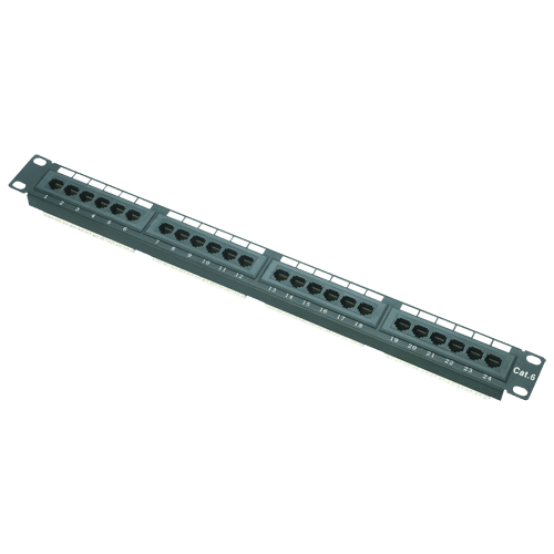 Patch panel de 24 portas UTP/RJ45 – Formato rack – Admite cabos até CAT6 – Tamanho 1U para facilitar a instalação – Dual IDC: 110 IDC e Krone IDC – Conexão rápida e simples