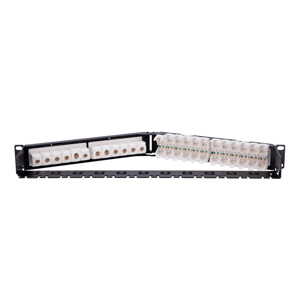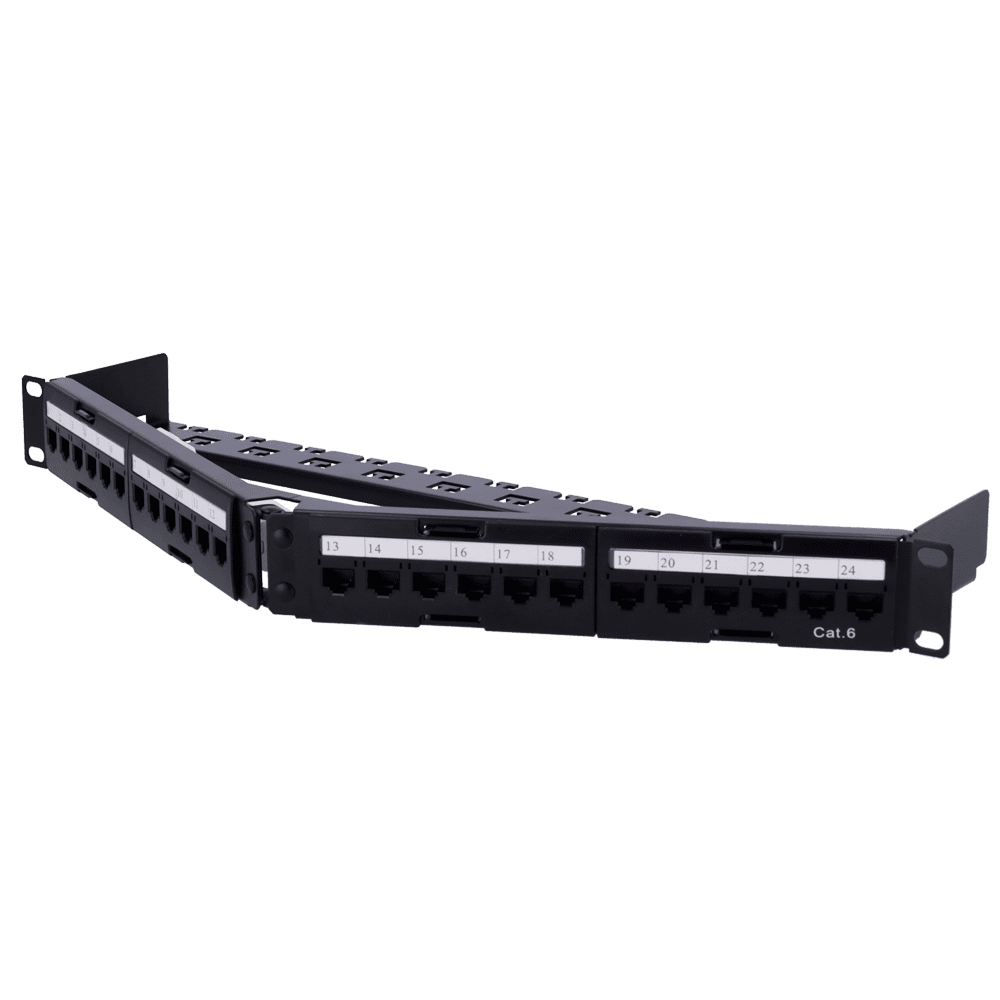 Patch painel angular de 24 portas – Admite cabos até CAT6 – Formato em bastidor 1U – Tamanho 1 U para facilidade de instalação – Barra de gestão de cabos não amovível