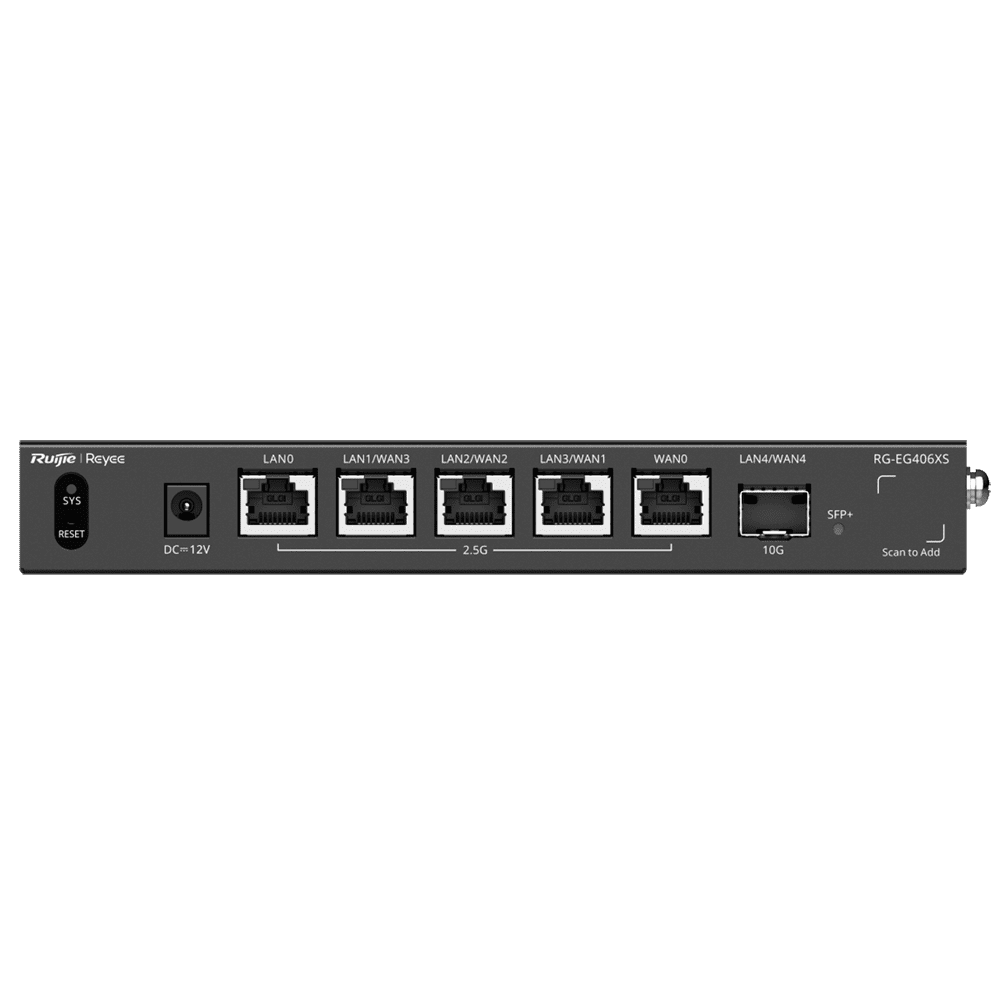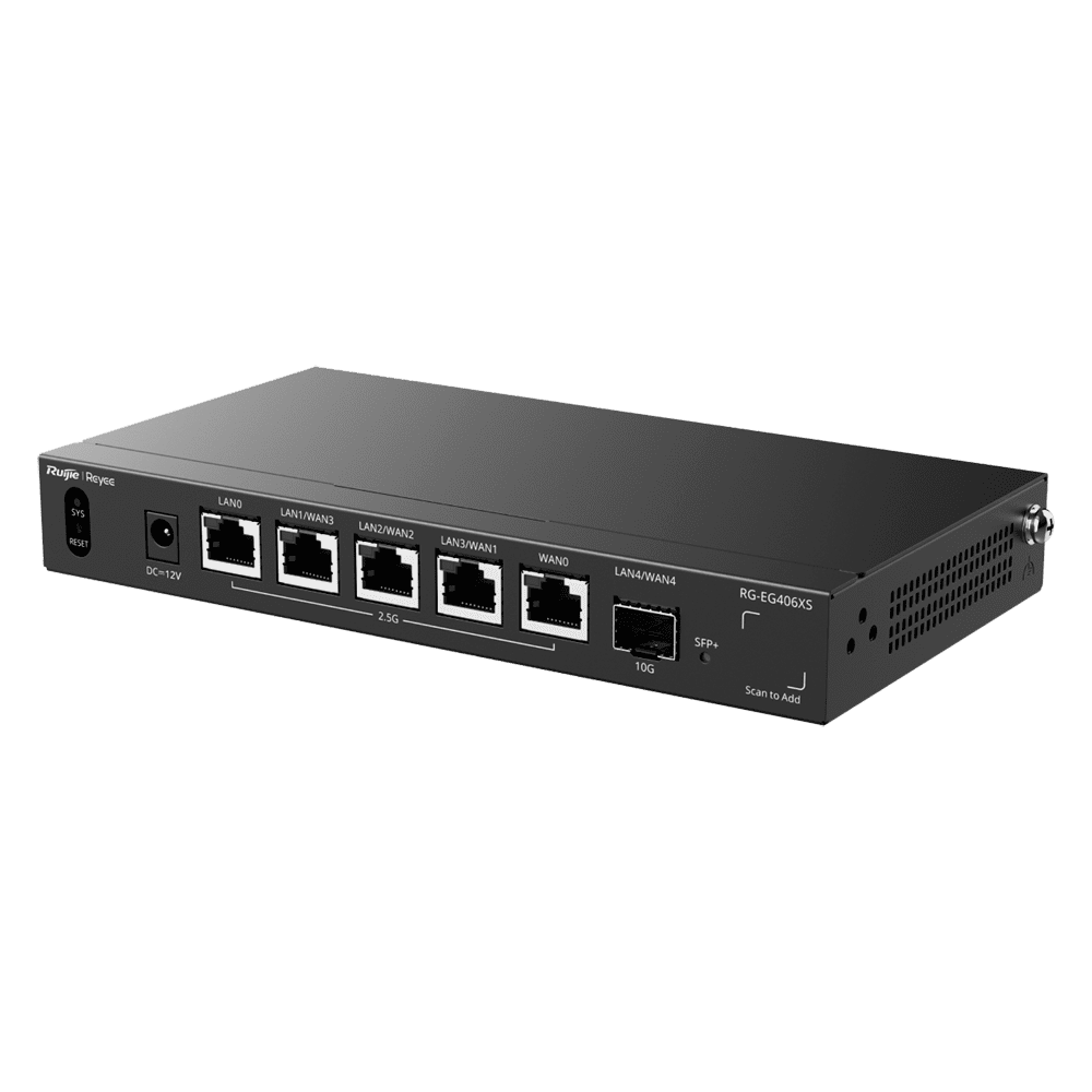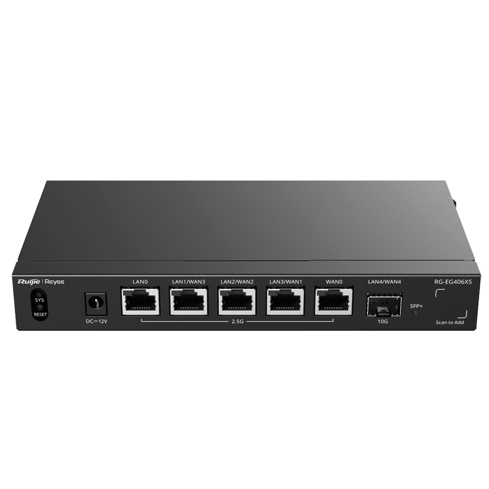 Reyee Router Cloud – 5 Portas RJ45 2.5G + 1 SFP+ 10Gigabit – Funções básicas da firewall – Suporta até 5 WAN para failover ou balanceamento – Até 2500 Mbps de largura de banda – Até 400 utilizadores recomendados