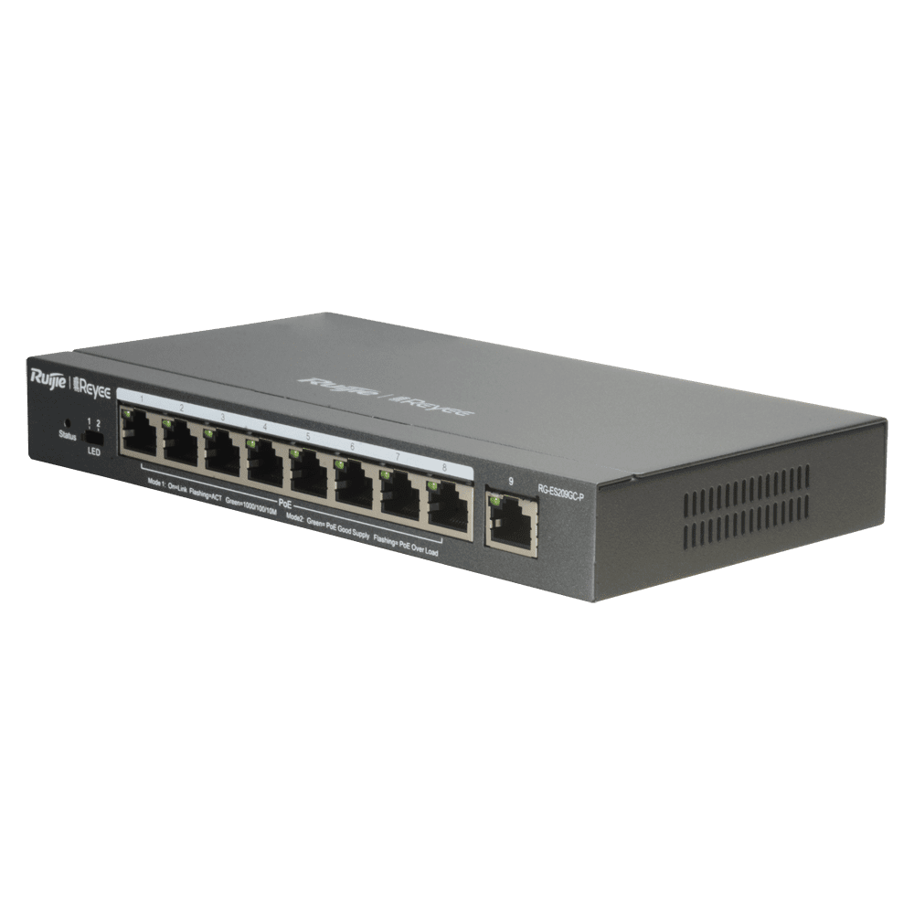 Reyee Manageable Cloud PoE Switch – 8 portas PoE 802.3af/at + 1 Uplink RJ45 – 8 RJ45 10/100/1000Mbps + 1 RJ45 10/100/1000Mbps – 30W por porta 802.3af/at / Máximo 120W – VLAN/Isolamento de portas/Detecção de loop – Limite de velocidade da porta