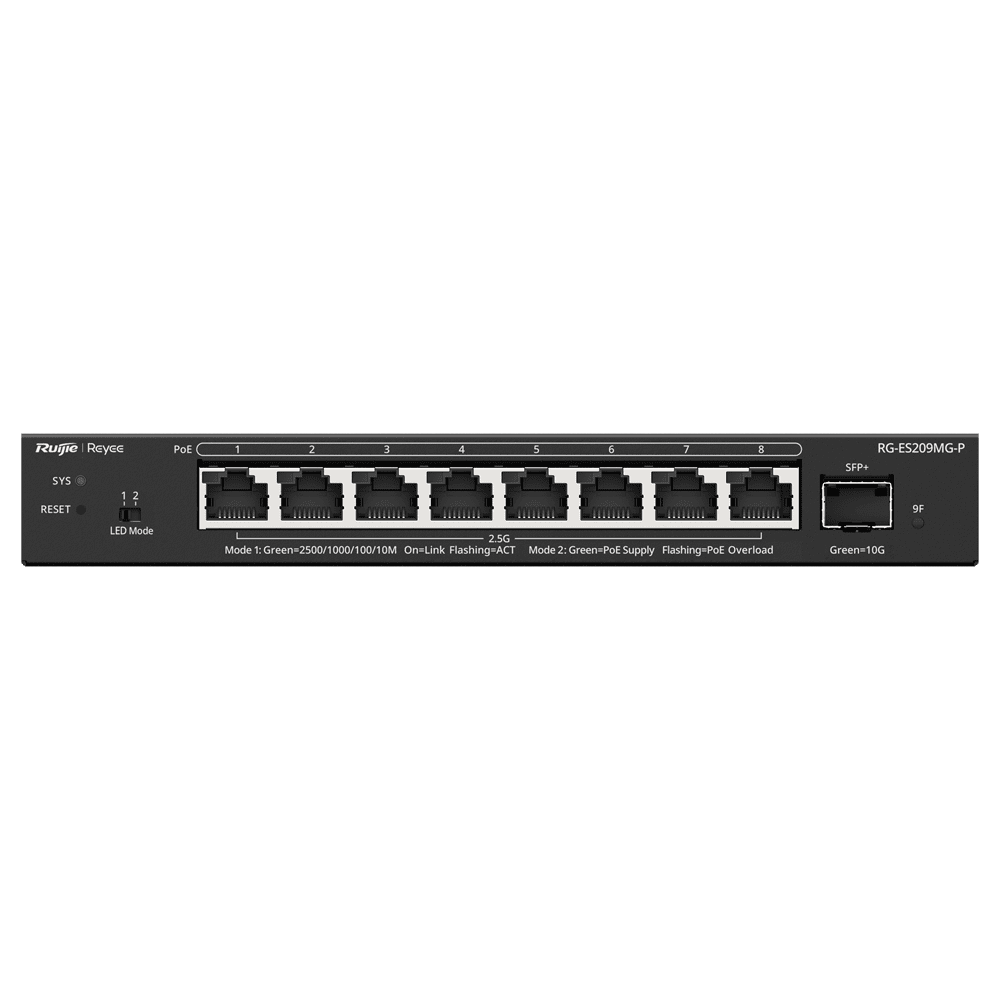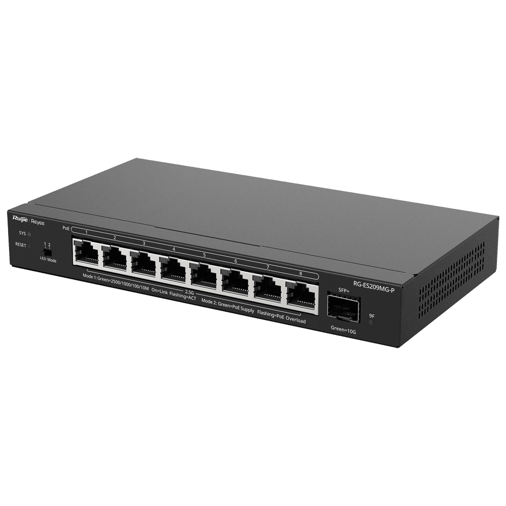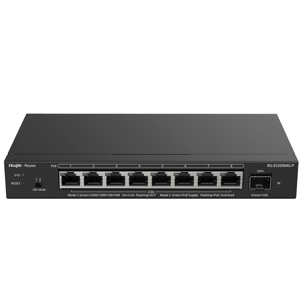 Reyee Switch PoE Cloud Layer 2 – 8 x portas PoE MultiGigabit y 1 x 10Gbps SFP+ – PoE 802.3af/at a 30w / Máximo 130W – Static LAG/DHCP Snoop/Port Mirror – VLAN/Port Isolation/PoE Watchdog – Pode ser montado em rack