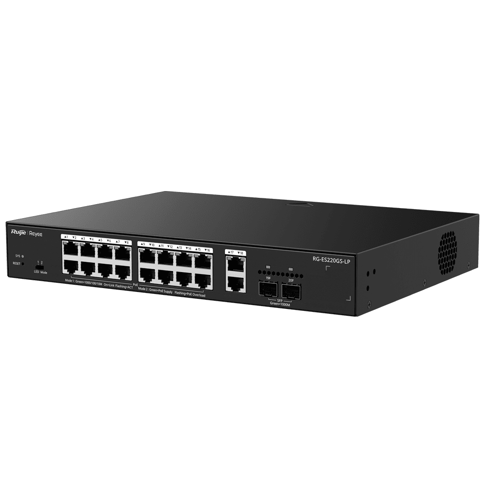 Reyee Manageable Cloud PoE Switch – 16 PoE 802.3af/at + 2 SFP + 2 uplink RJ45 – 18 RJ45 10/100/1000Mbps + 2 SFP 10/100/1000 – 30W por porta 802.3af/at / Máximo 130W – VLAN/Isolamento de portas/Detecção de loop – Limite de velocidade da porta