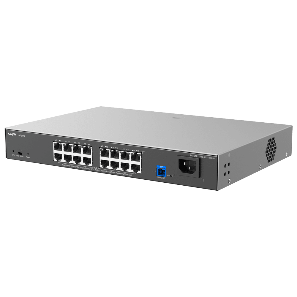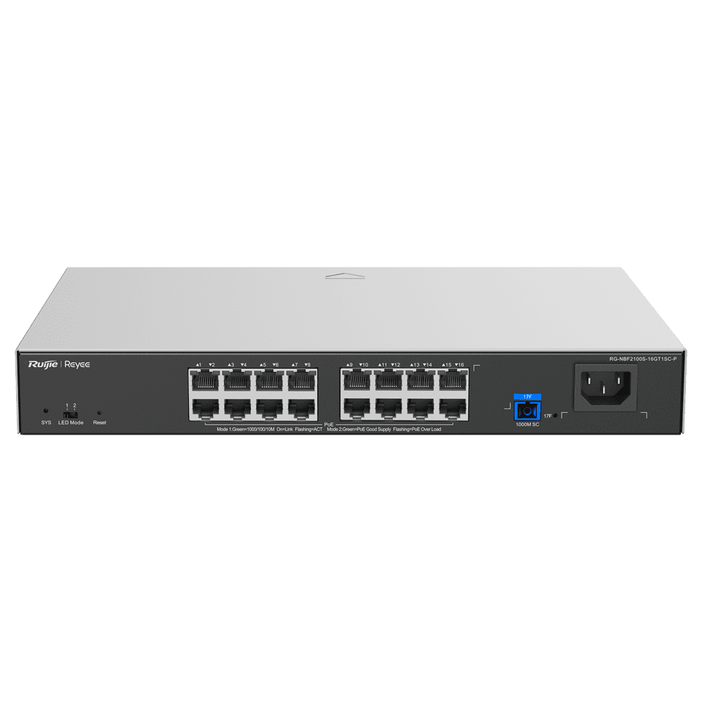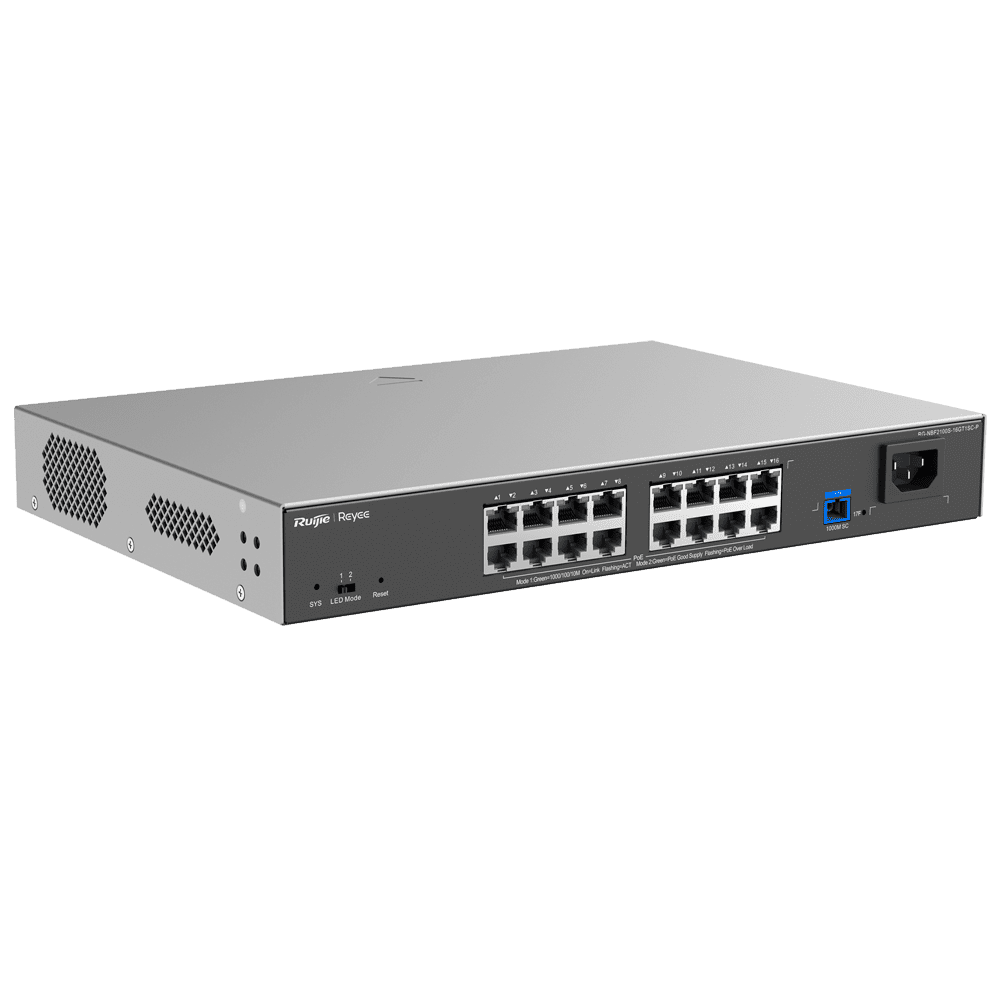 Reyee E-Lighten Switch PoE Cloud Capa 2 – 16 portas RJ45 Gigabit 802.3af/at – 1 Porta ótica SC 1G (PON) – 30W por porta 802.3af/at / Máximo 240W – VLAN/ Isolamento de porta/ Prevenção de loops – DHCP Snooping/Espelhamento de portas