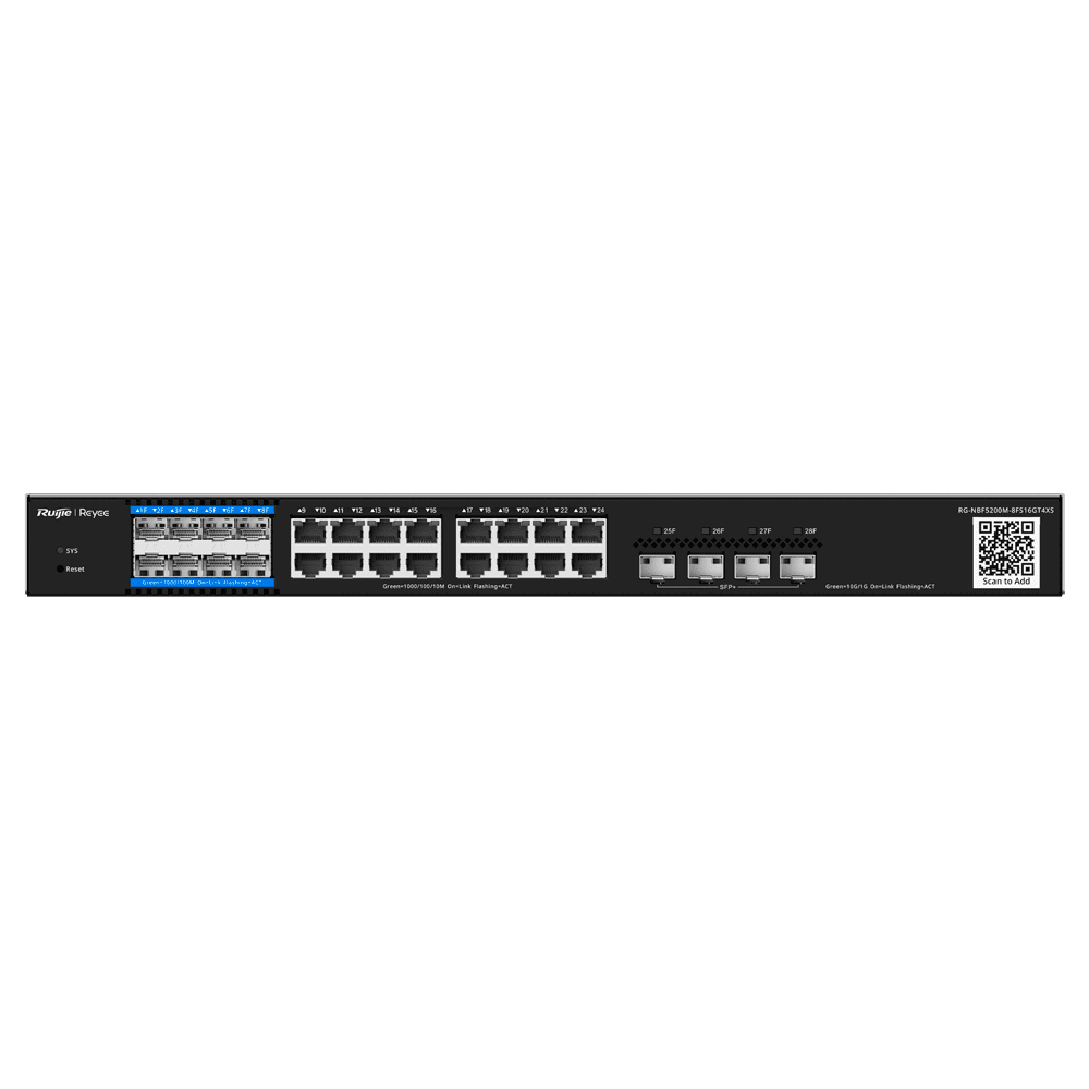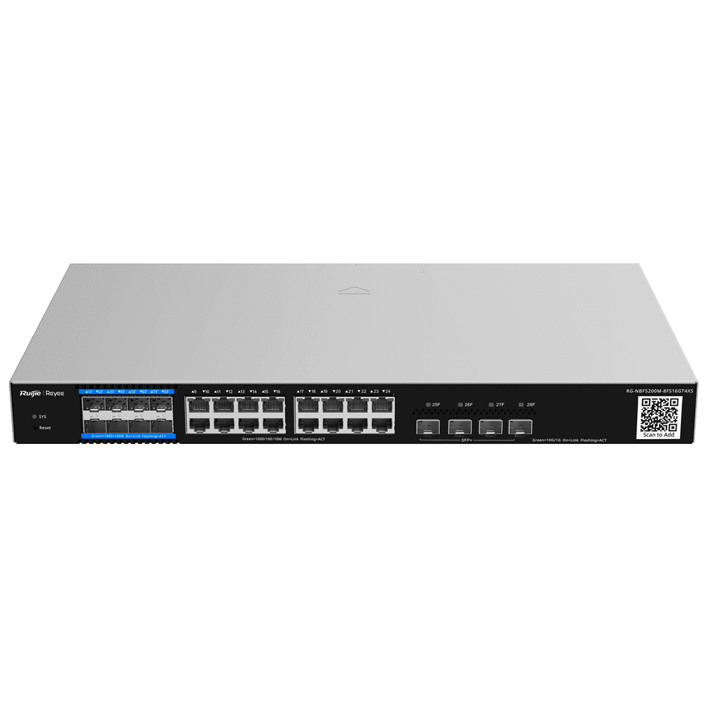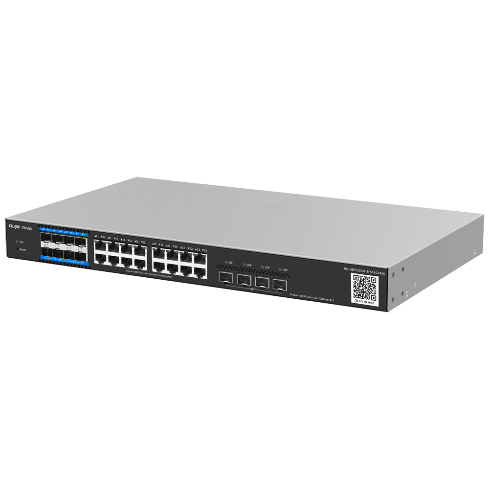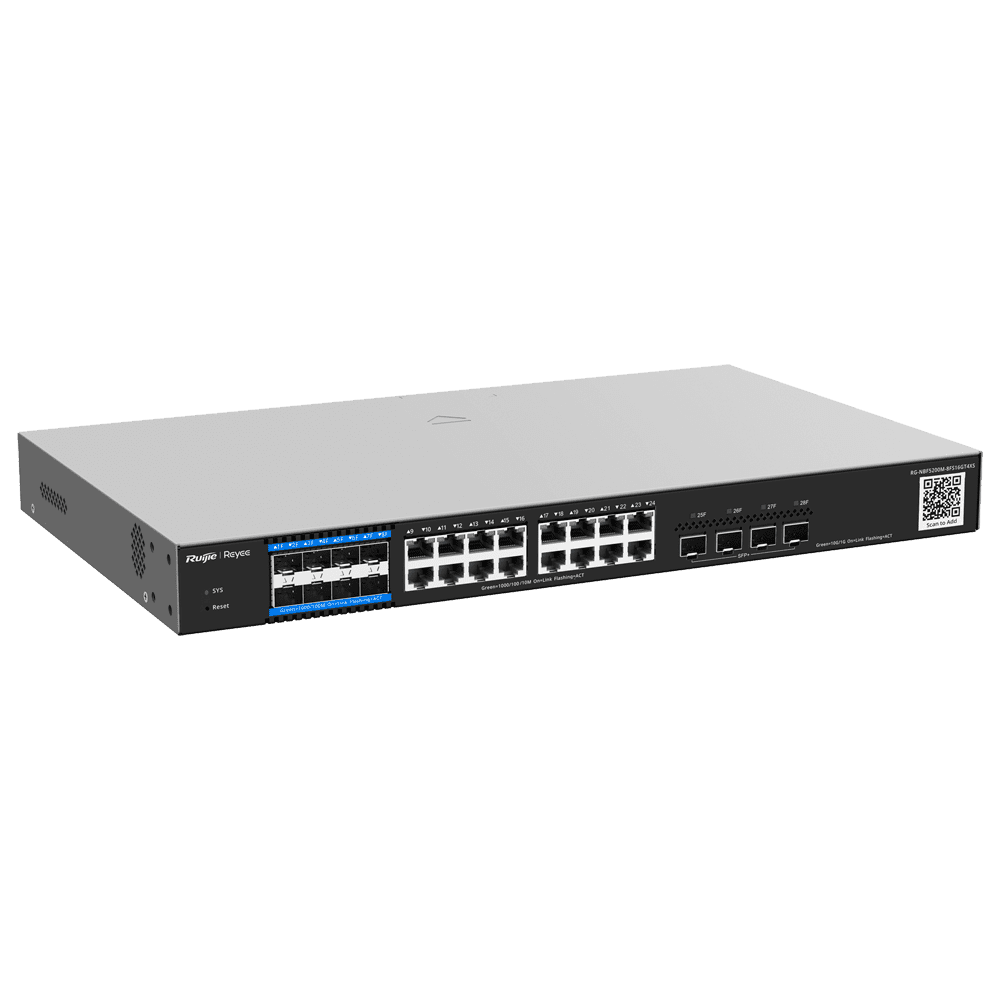 Reyee E-Lighten Switch Cloud Capa 3 – 16 portas RJ45 Gigabit + 4 portas SFP+ 10 Gbps – 8 E-Lighten SFP Ports (PON/Ethernet) – Static LAG/DHCP Snoop/IGMP Snoop/Port Mirror – VLAN/Porta Isolation/STP/RSTP/ACL/QoS/802.1X – Servidor DHCP/Rotas estáticas/RIP/OSPF/SNMP