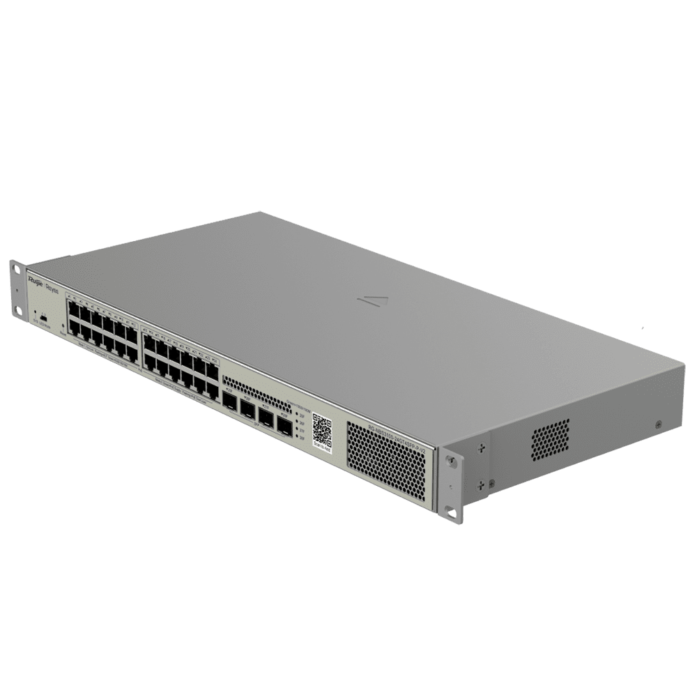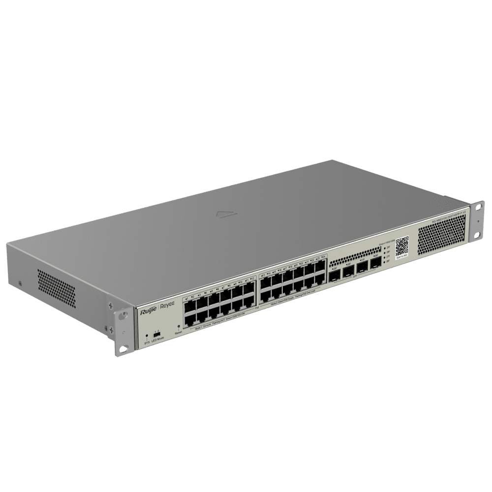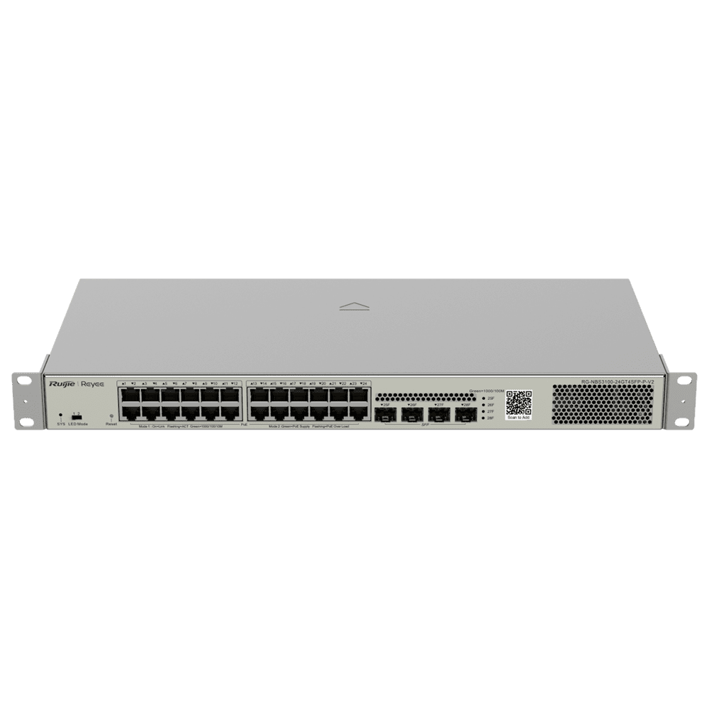 Reyee Switch PoE Cloud Layer 2+ – 24 portas PoE Gigabit+ 4 SFP Gigabit – 30W por porta 802.3af/at / Máximo 370W – Static LAG/DHCP Snoop/IGMP Snoop/Port Mirror – VLAN/isolamento de porta/STP/RSTP/ACL/QoS/LACP/SNMP – Pode ser montado em rack
