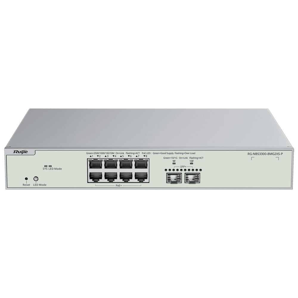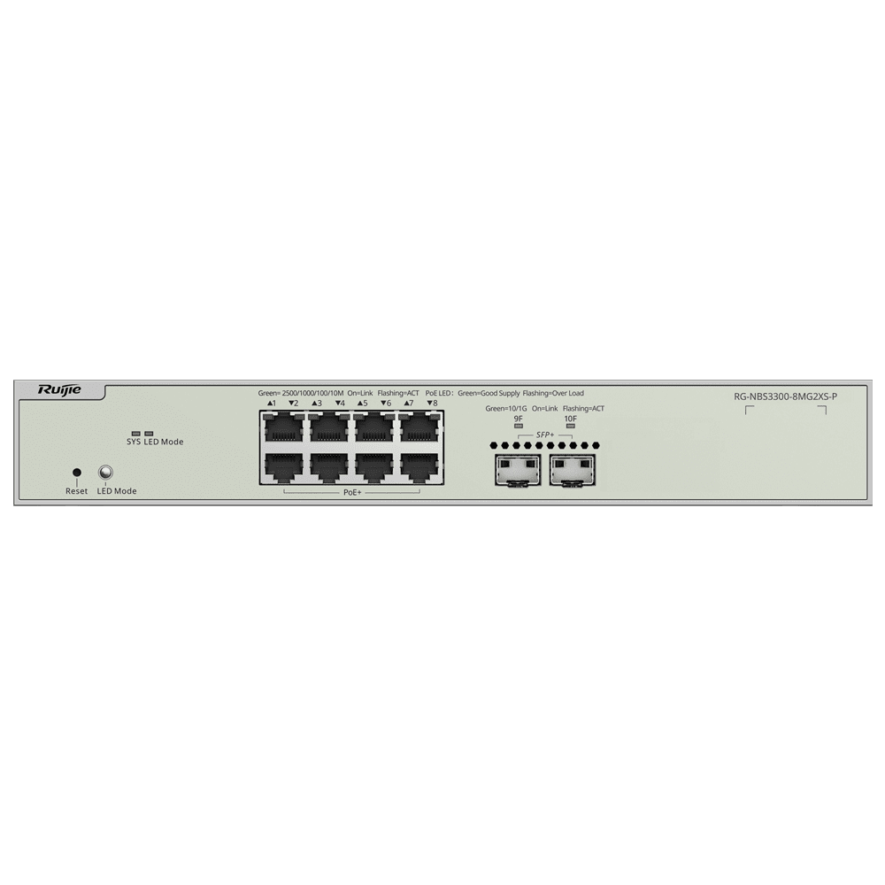 Reyee Switch PoE Cloud Layer 2 – 8 portas PoE MultiGigabit+ 2 10Gbps SFP+ – PoE 802.3af/at Máximo 240W – Static LAG/DHCP Snoop/IGMP Snoop/Port Mirror – VLAN/Insolação de portas/STP/RSTP/ACL/QoS – Pode ser montado em rack