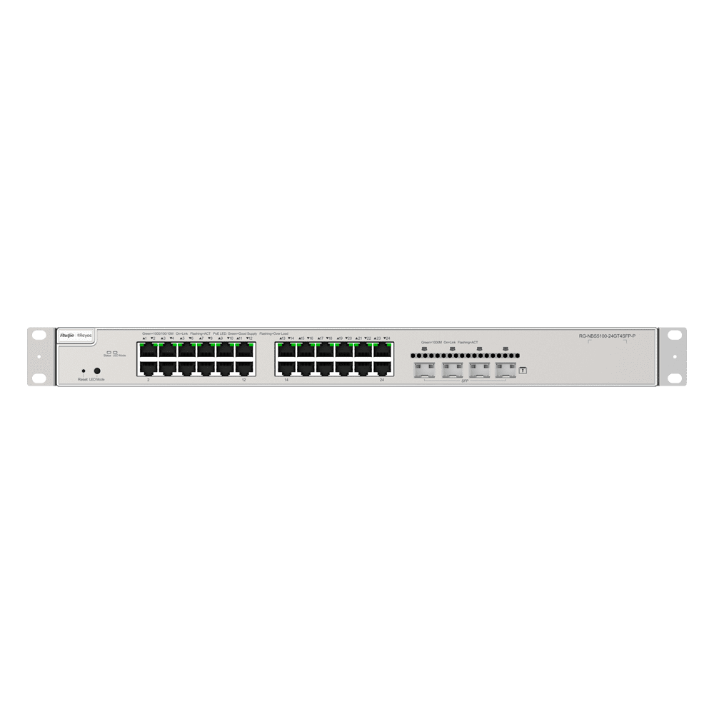 Reyee Switch PoE Cloud Layer 3 – 24 Portas PoE RJ45 Gigabit + 4 Gigabit SFP – 30W por porta 802.3af/at / Máximo 370W – Static LAG/DHCP Snoop/IGMP Snoop/Port Mirror – VLAN/Porta Isolation/STP/RSTP/ACL/QoS/802.1X – Servidor DHCP/Rotas estáticas/RIP/OSPF/SNMP