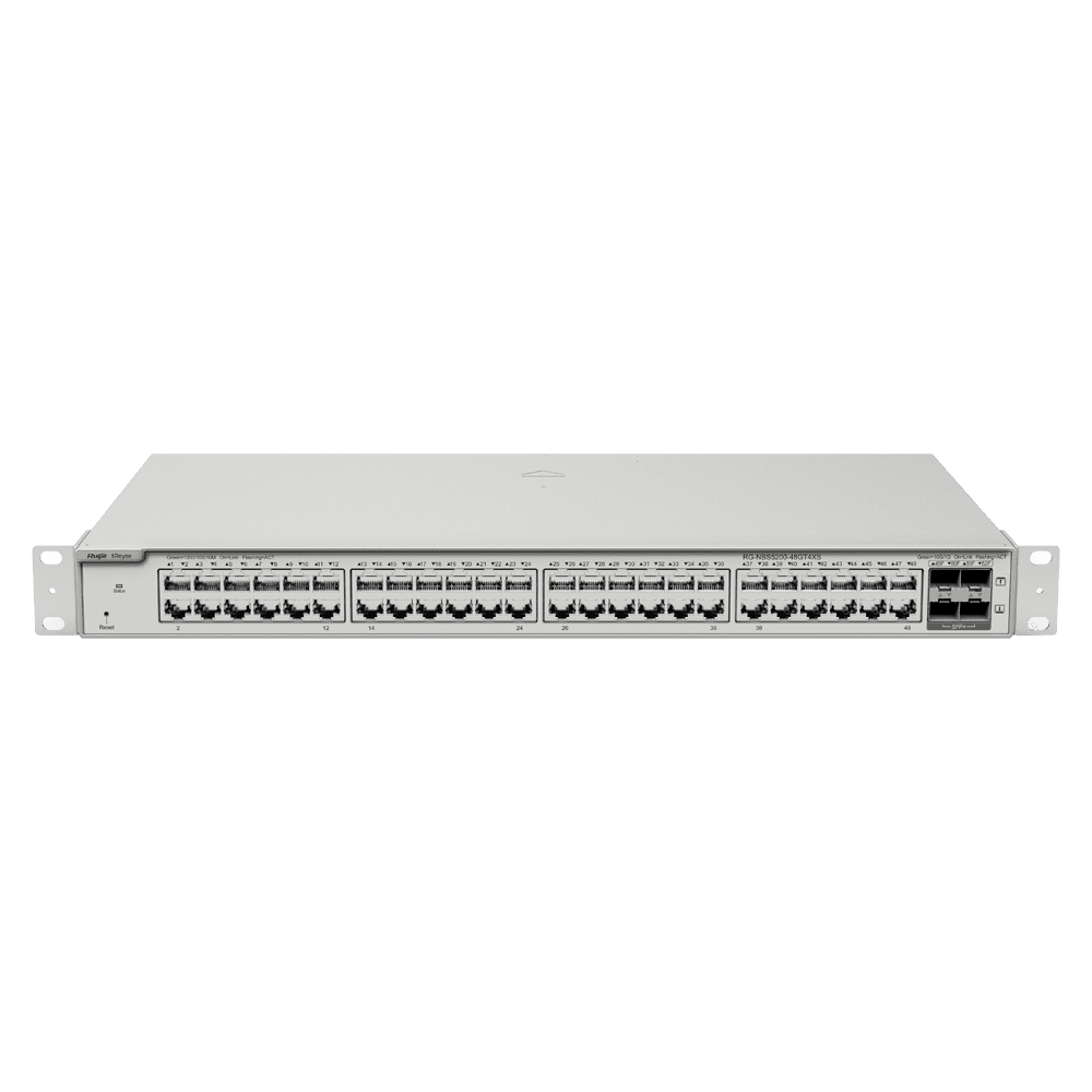 Reyee Switch Cloud Capa 3 – 48 portas RJ45 Gigabit – 4 portas SFP+ 10 Gbps – Static LAG/DHCP Snoop/IGMP Snoop/Port Mirror – VLAN/Porta Isolation/STP/RSTP/ACL/QoS/802.1X – Servidor DHCP/Rotas estáticas/RIP/OSPF/SNMP