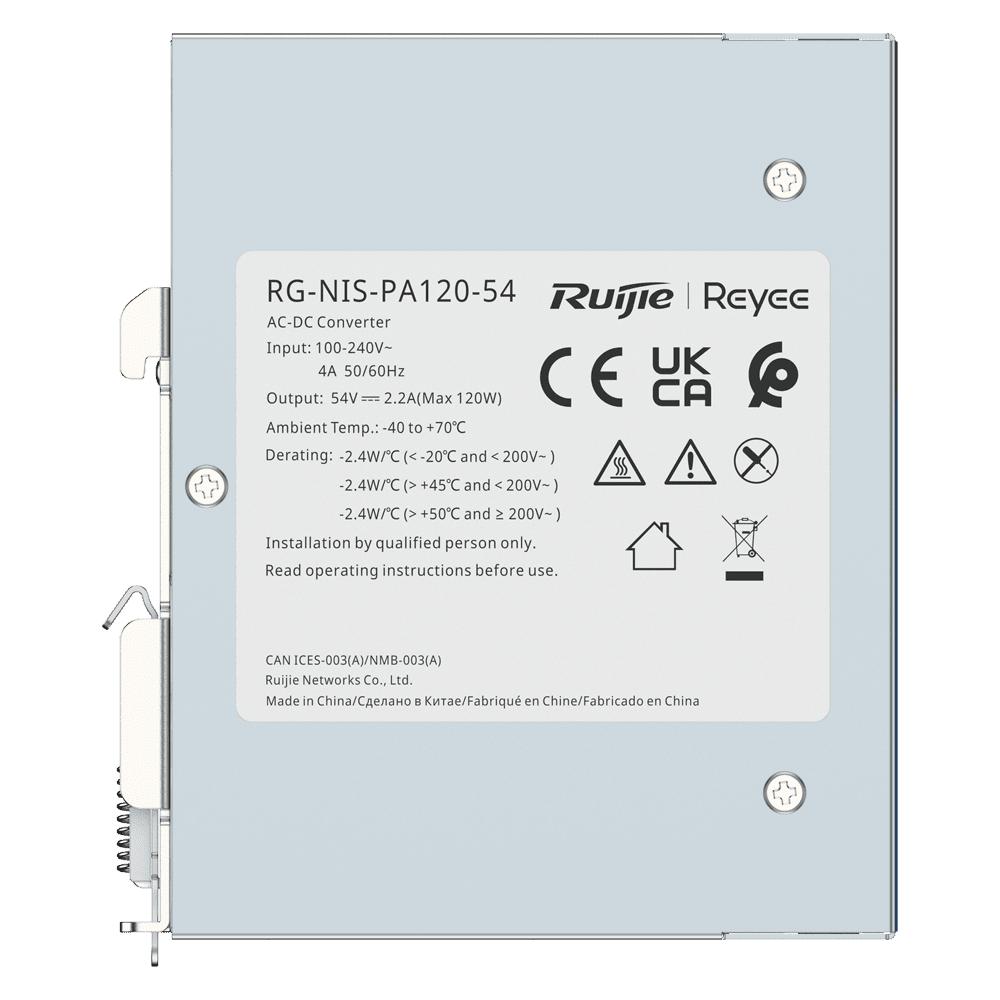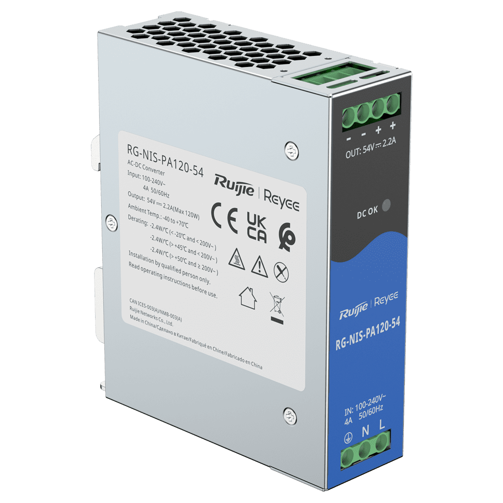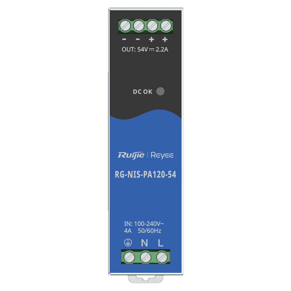 Fonte de alimentação industrial Reyee – Saída CC 54 V 2,2A / 120 W – 2 saídas DC – Voltagem entrada 100 V ~ 240 V – 125 (Al) x 35 (Lg) x 100 (Fd) mm – Montagem em carril DIN