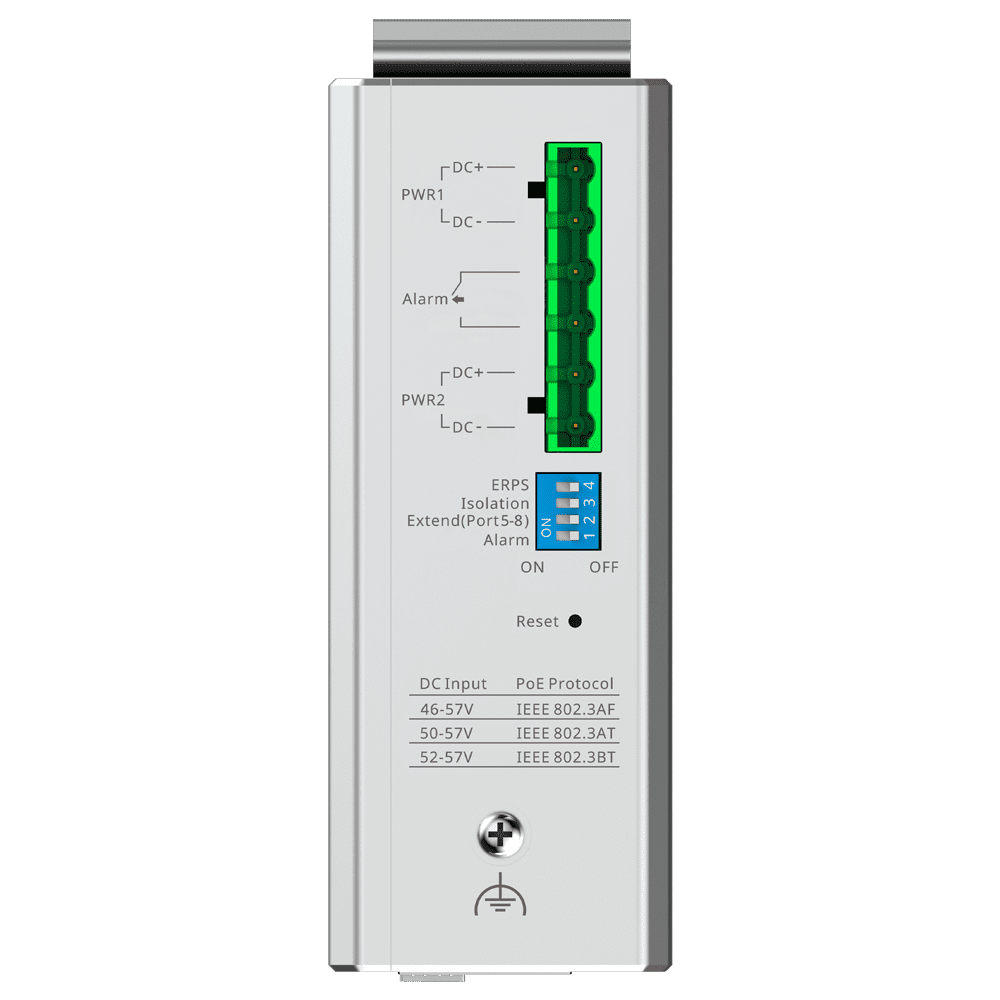 Reyee Switch Industrial PoE Cloud Capa 2 – 8 portas RJ45+ Gigabit + 2 portas SFP Gigabit – 8 Portas PoE+ 30W + 1 Portas Hi-PoE 90W – PoE alargado (portas 5~8) / Isolamento de portas – VLAN/ERPS/Prevenção de loops/Watchdog/DHCP Snooping – Montagem em carril DIN