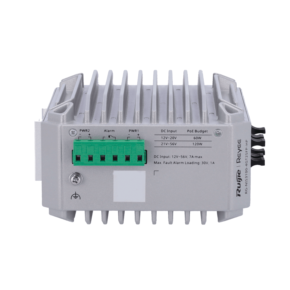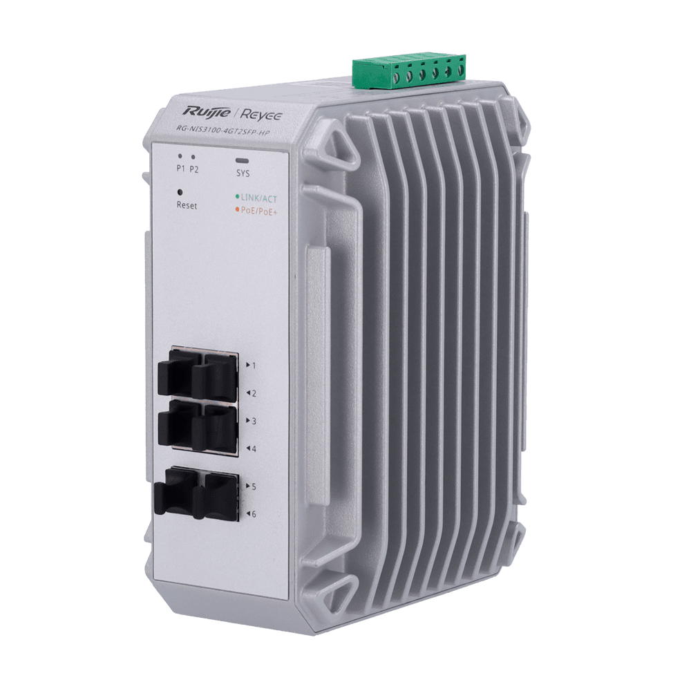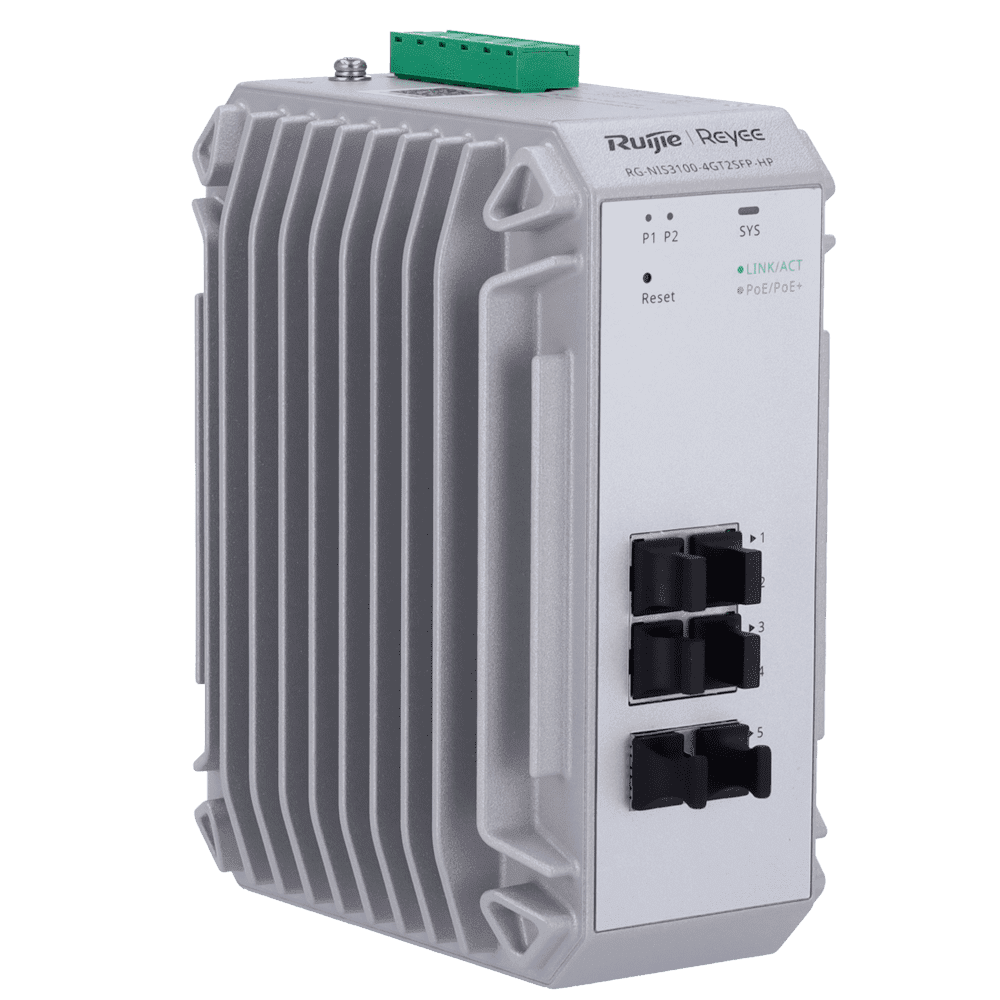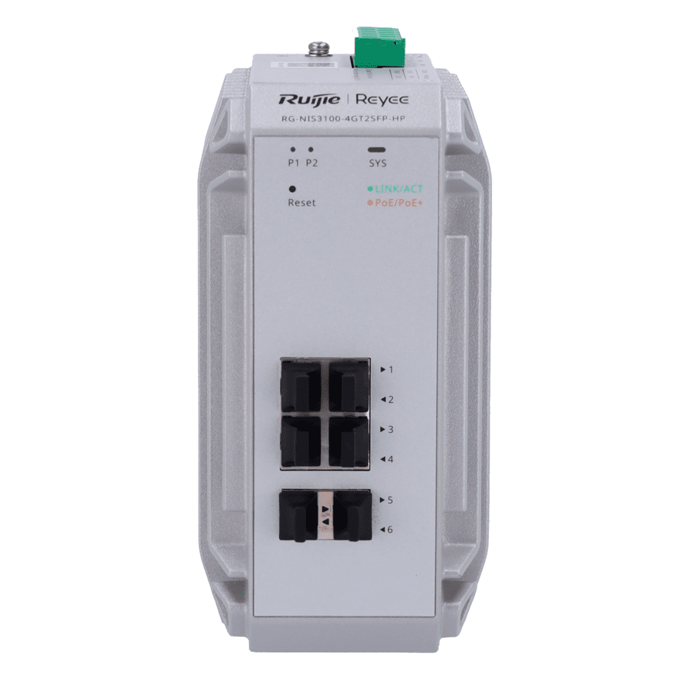 Reyee Switch Industrial PoE Cloud Capa 2 – 4 portas Gigabit PoE+ + 2 portas Gigabit SFP – 30W por porta 802.3af/at / Máximo 120W – Static LAG/DHCP Snoop/IGMP Snoop/Port Mirror – Prevenção de VLAN/Loop/STP/RSTP/ACL/Watchdog – Montagem em carril DIN