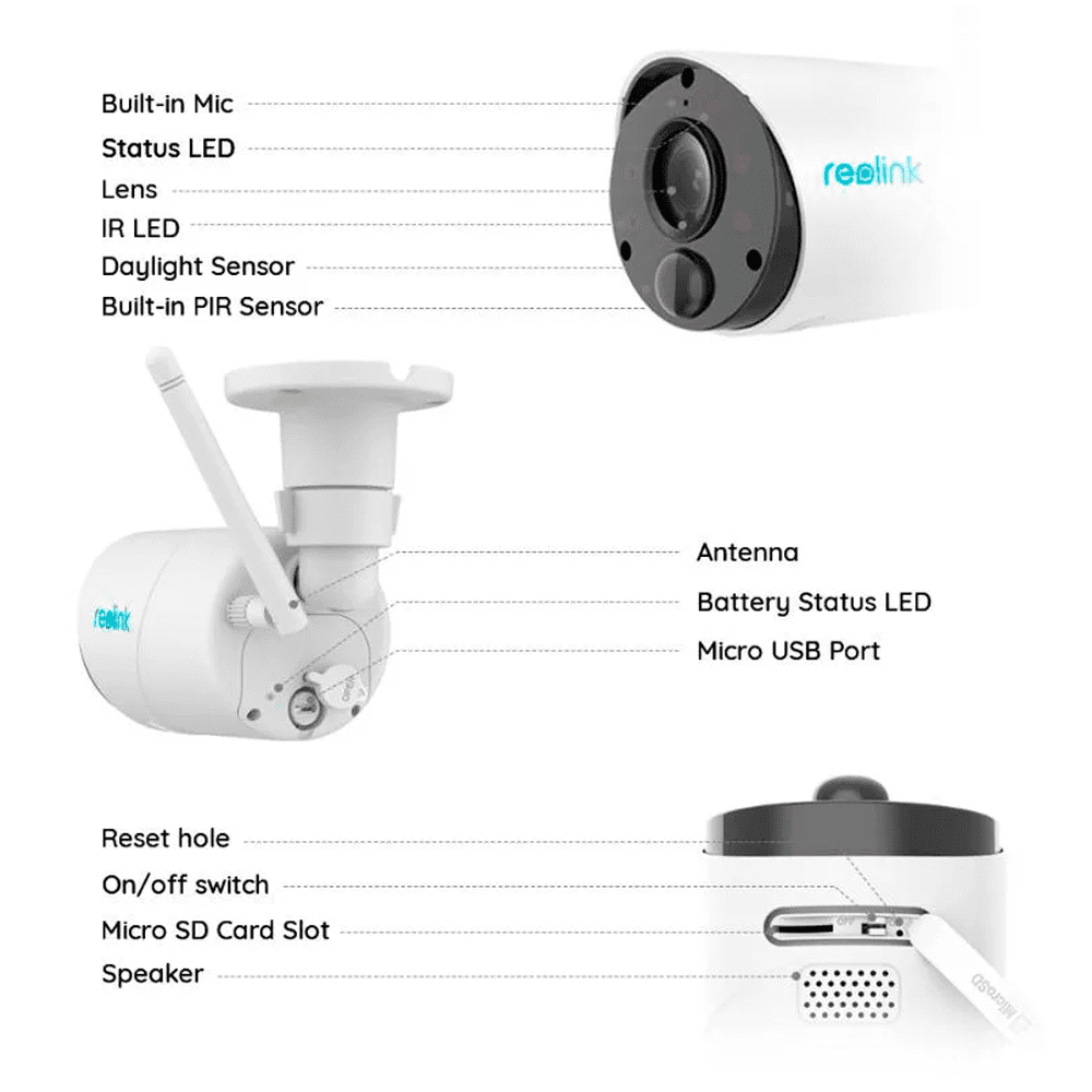 | Fonte de alimentação (carregador) | CA 5V/1A (compatível com o painel solar Reolink) |