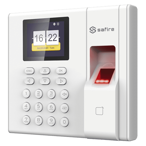 Controlo de presença – Impressão digital, cartão EM e PIN – 1.000 user | 100.000 records – TCP/IP, USB e modos de presença – 2.4″ TFT | Bateria de reserva – Safire Control Center
