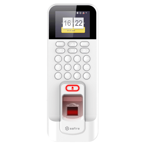 Controlo de acesso e presença – Impressão digital, cartão EM e PIN – 3.000 utilizadores | 100.000 registos – TCP/IP, WiFi, USB, Wiegand e modos de presença – 2.4″ TFT | Controlador integrado – Safire Control Center