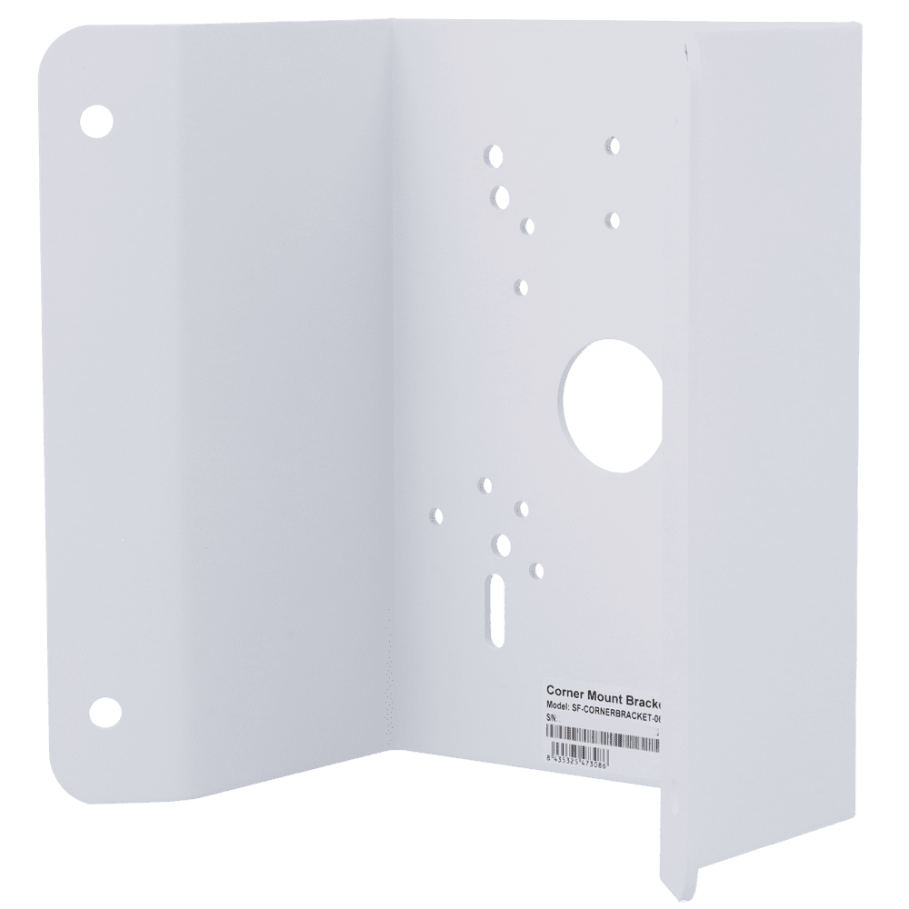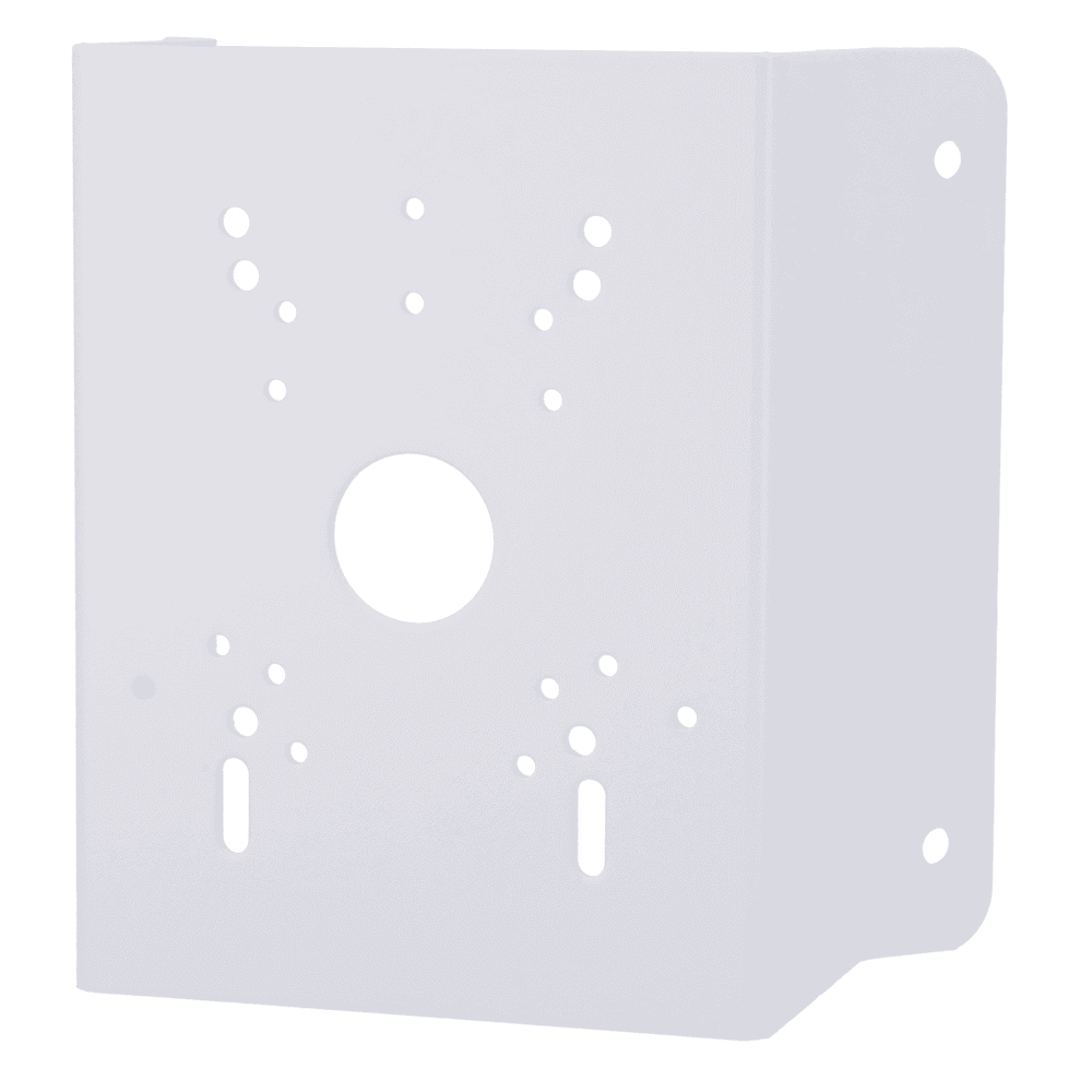 Suporte de canto inteligente Safire – Para câmaras bullet ou dome – Fabricado em aço laminado SPCC – Cor branco – Passador de cabos – 215 (Al) x 215 (Lg) x 121.4 (Fd) mm
