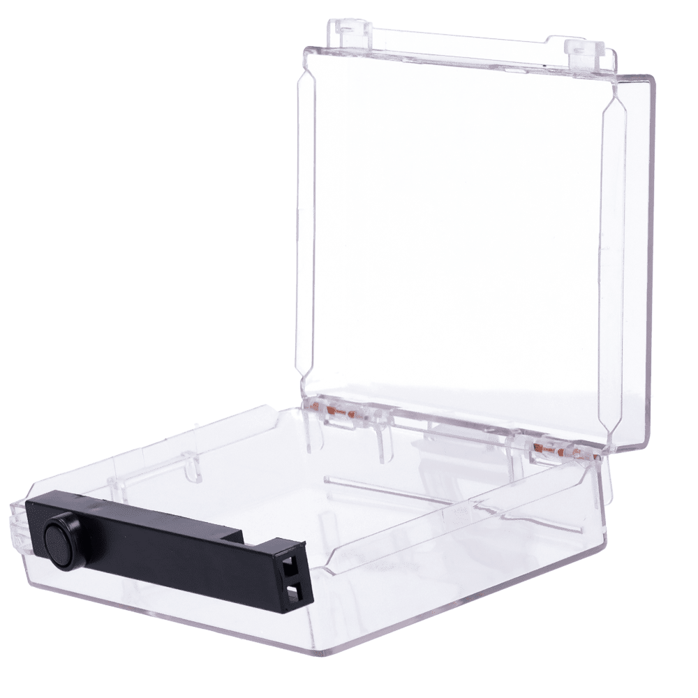 Proteção eletrónica antirroubo EAS – AM 58 kHz | Desbloqueio magnético – Caixa transparente em policarbonato – Medidas int.: 110 (Lg) x 125 (Al) x 36 (Pf) mm – Medidas ext.: 117 (Lg) x 85 (Al) x 33 (Pf) mm – Compatível com antenas AM