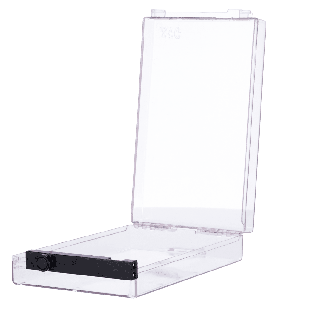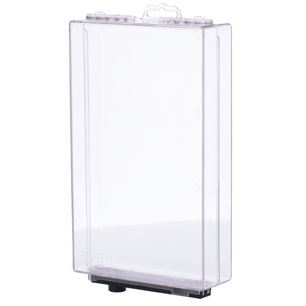 Proteção eletrónica antirroubo EAS – AM 58 kHz | Desbloqueio magnético – Caixa transparente em policarbonato – Medidas int.: 220 (Lg) x 120 (Al) x 45 (Pf) mm – Medidas ext.: 182 (Lg) x 115 (Al) x 40 (Pf) mm – Compatível com antenas AM