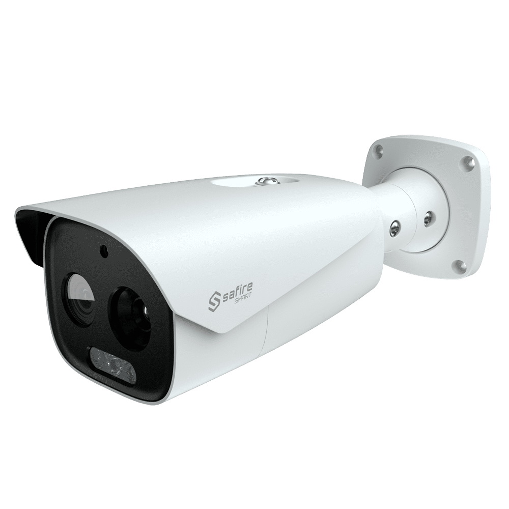 Câmara térmica Dual Bullet IP Safire Smart – Sensor térmico 12 m 384×288 VOx | Lente 25 mm – Sensor óptico 1/2.7 5 Mpx | Lente 16 mm – Sensibilidade térmica 35mK – IA baseada na classificação humana e de veículos – Taxa de medição do tempo -20~150ºC / ± 8ºC