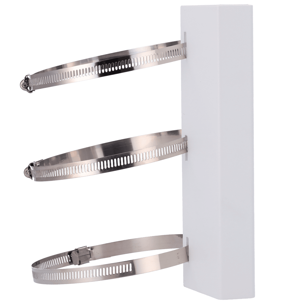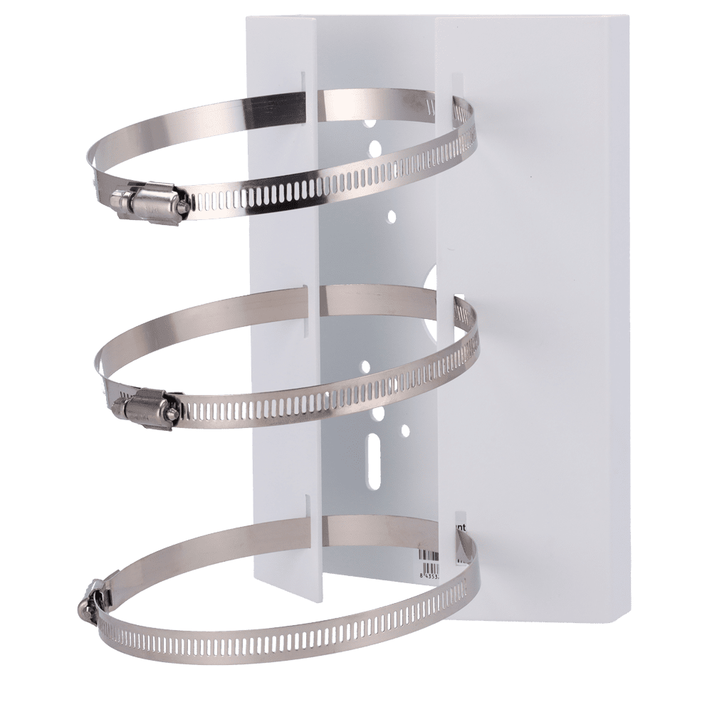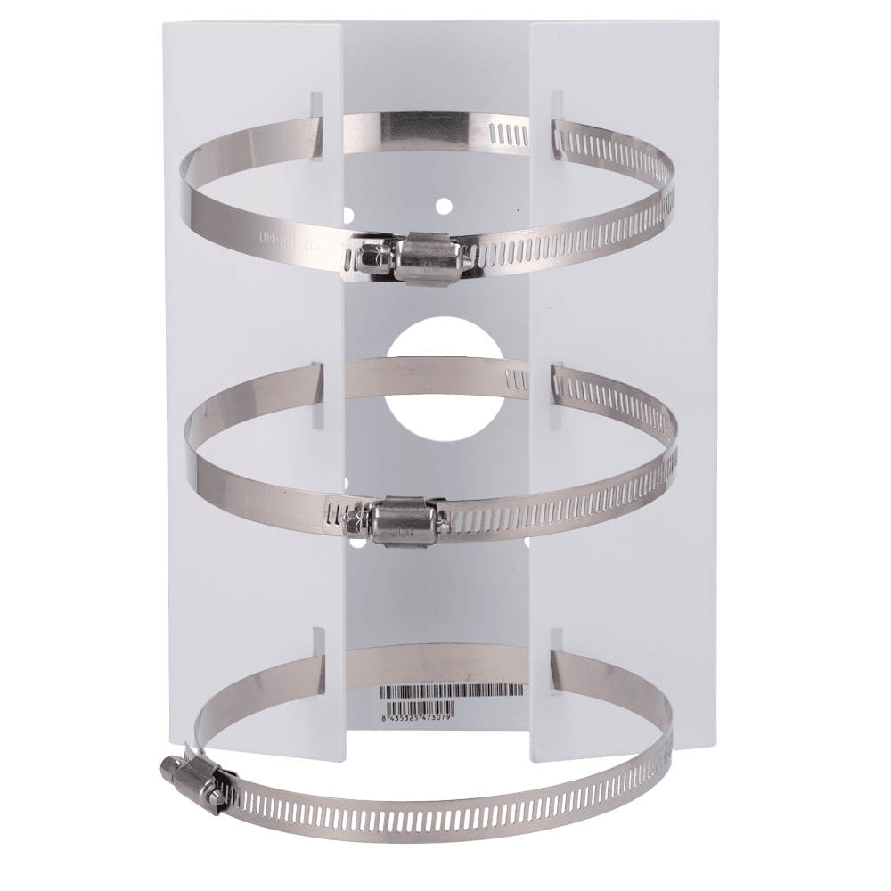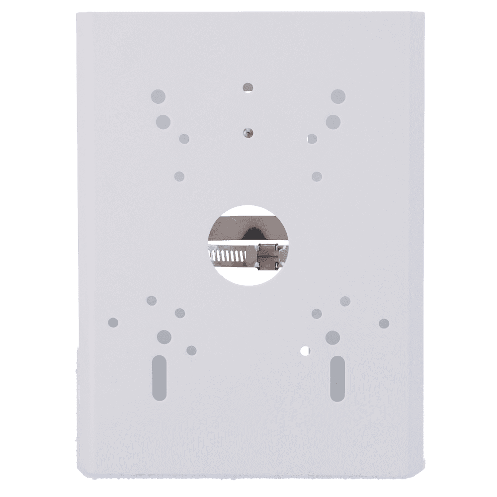 Suporte de mastro/pólo Safire Smart – Para câmaras domo motorizadas – Intervalo diâmetro 118~140 mm – Fabrico de aço laminado SPCC – Cor branca 215 (A) x 164.7 (L) x 54 (P) mm – Passador de cabos