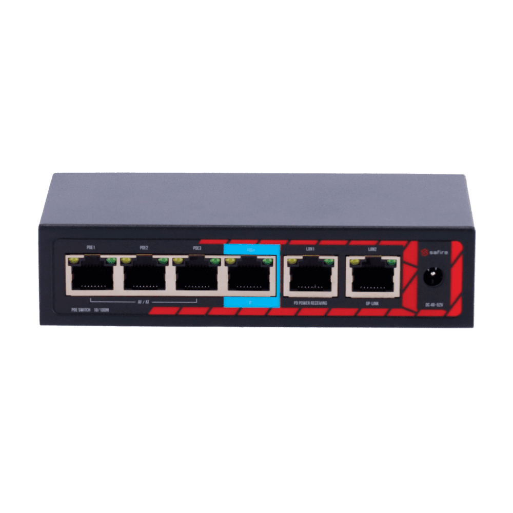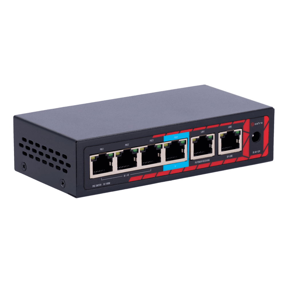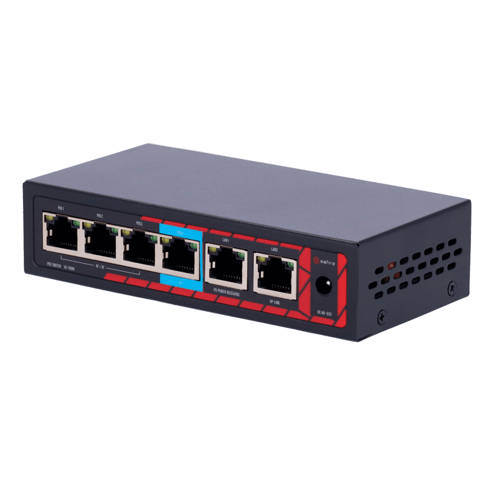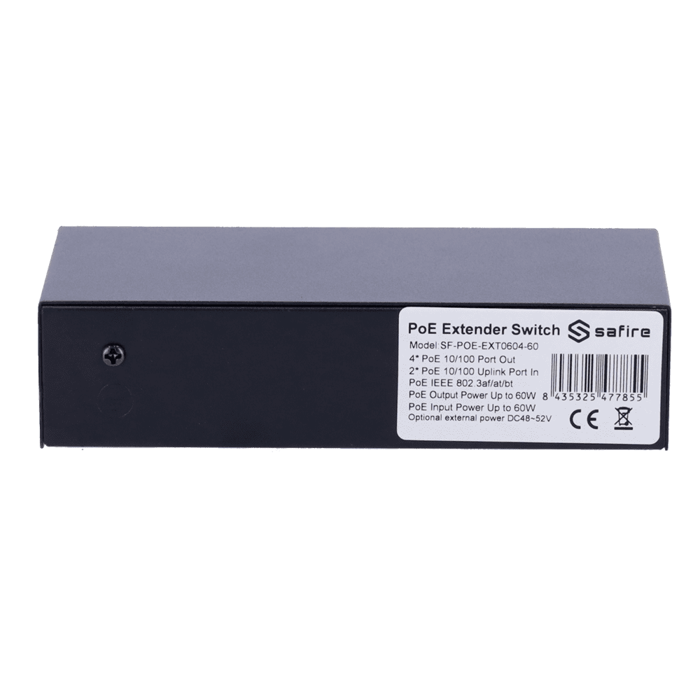 Safire Indoor Hi-PoE Extender Switch – Aumenta o alcance da potência PoE – 4 portas PoE + 2 Uplink RJ45 – IEEE 802.3 af/at/bt – Potência máxima de saída 60 W – Portas 10/100 Mbps