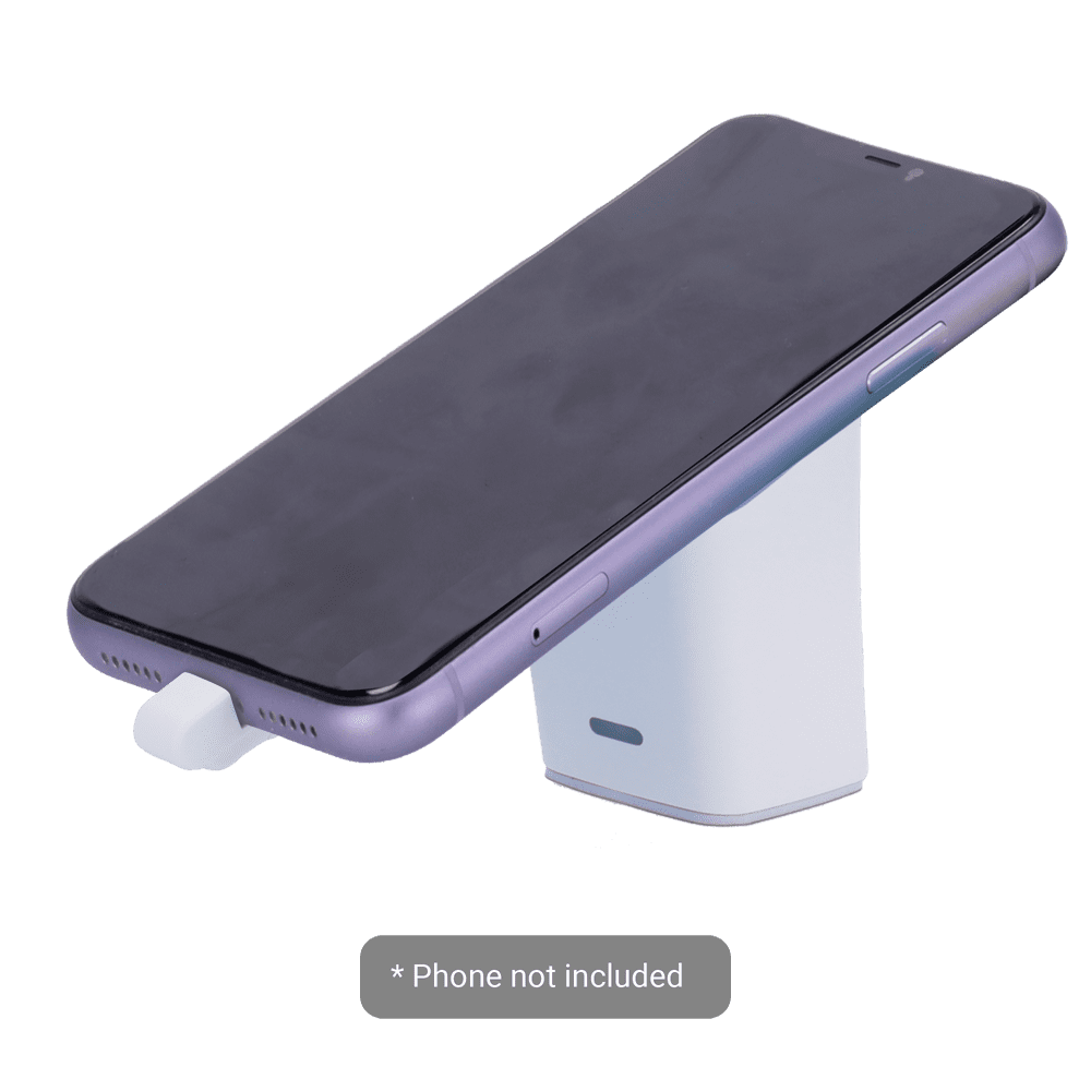 Suporte com alarme antirroubo EAS – Adequado para telemóveis – Ligação com cabo Lightning (iPhone) – Alarme sonoro 100 db e alarme luminoso – Fonte de alimentação CC 5 V com bateria incorporada – Dimensões: 50 (Lg) x 78 (Al) x 47 (Pf) mm