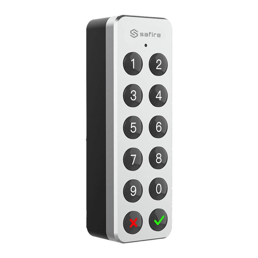 Acessório de teclado – Compatível com SF-SMARTLOCK-BT e SF-SLRELAY-BT – Abertura e fechamento remoto de fechadura e relé – Abertura via teclado – Códigos de uso único ou temporários – Alimentado por duas pilhas AA ou microUSB