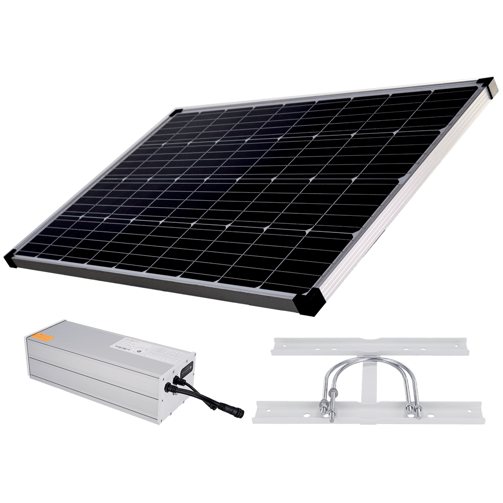 Sistema autónomo de fornecimento de energia para CCTV – Painel solar de 200W – Bateria de lítio LiFePo4 1280Wh (100Ah) – Regulador MPPT integrado – Apoio para ancoragem de mastro – RS-485 para comunicação