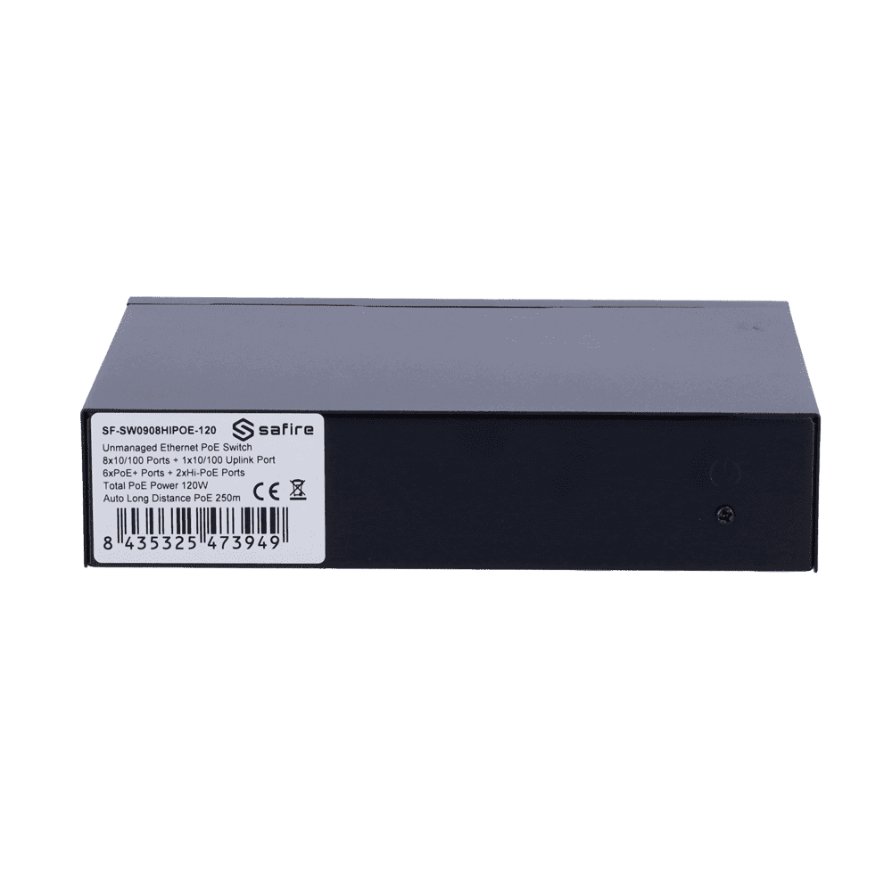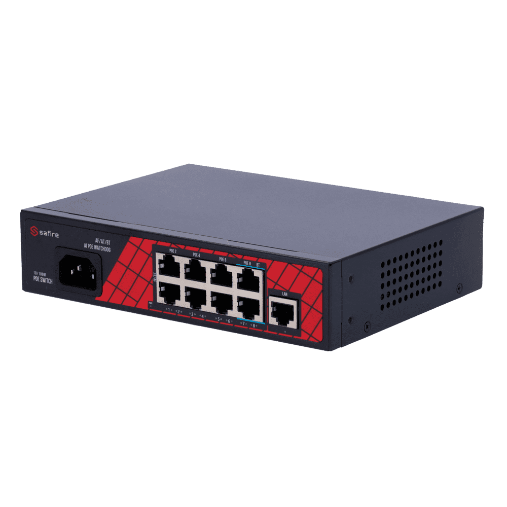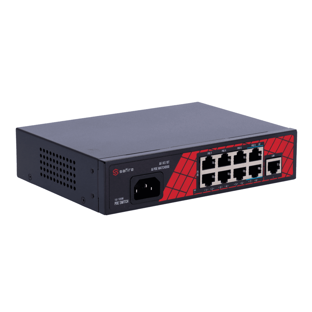 Safire Switch Hi-PoE – 8 portas PoE + 1 Uplink RJ45 – Velocidade da porta 10/100Mbps – 6 Portas PoE+ 30W + 2 Portas Hi-PoE 60W – Potência PoE total de 120W / PoE Watchdog – Auto Adaption PoE Estendido Até 250m