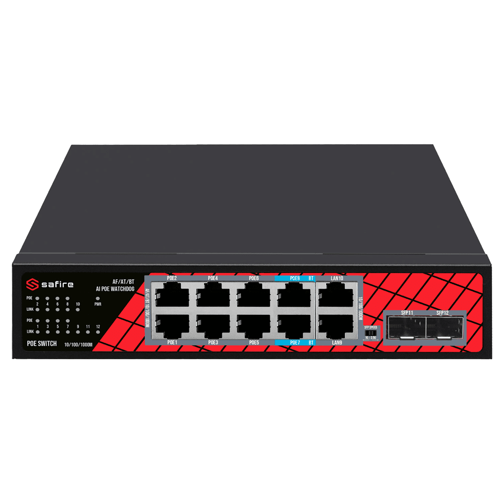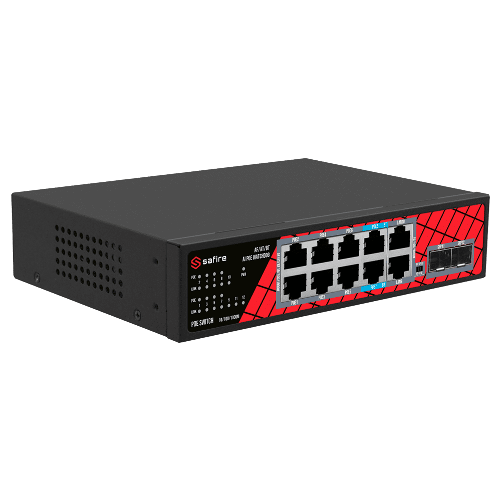 Safire Switch Hi-PoE – 8 Portas PoE + 2 SFP + 2 RJ45 – Velocidade da porta Gigabit 10/100/1000Mbps – 6 Portas PoE+ 30W + 2 Portas Hi-PoE 60W – PoE Watchdog – Até 120W Potência PoE total