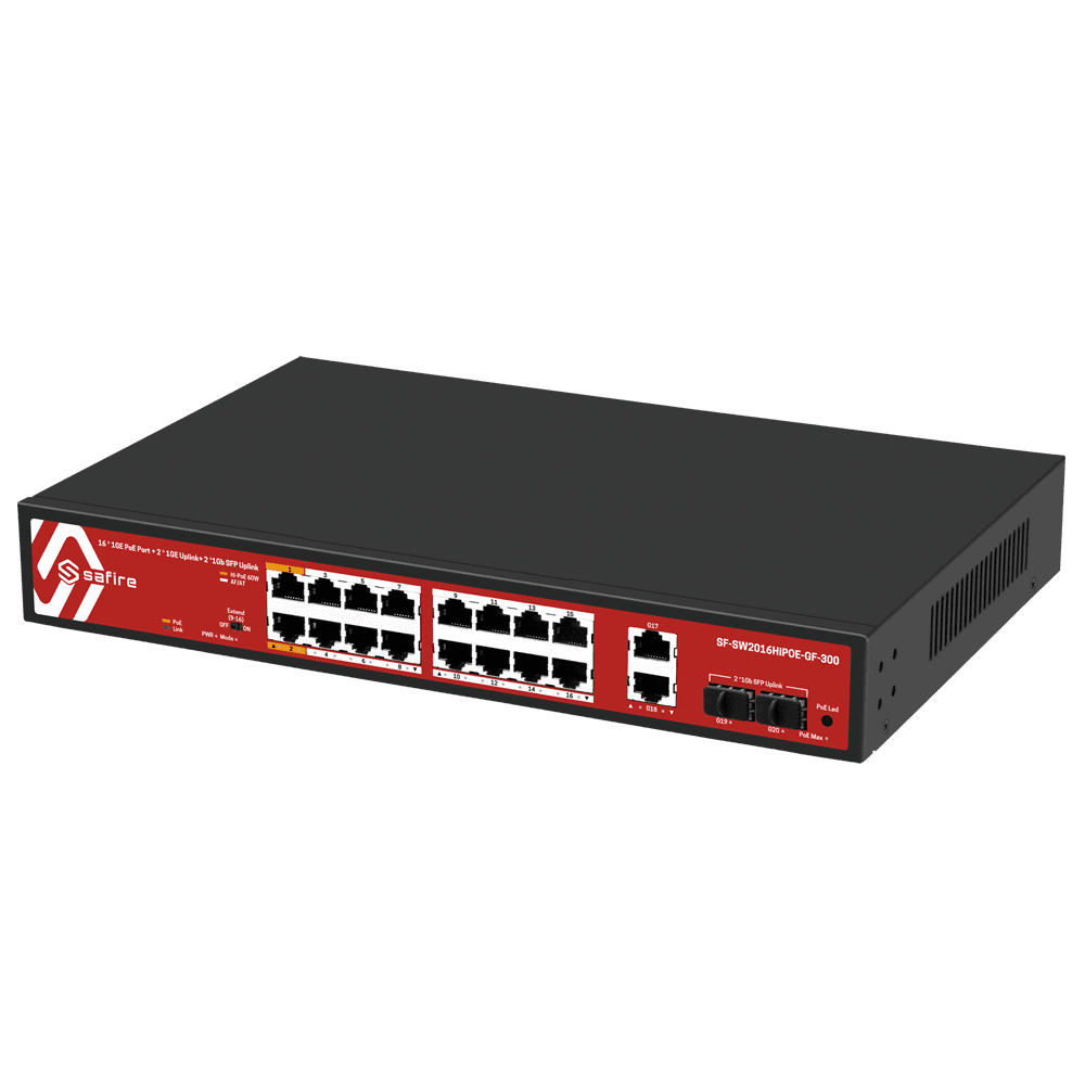 Safire Switch Hi-PoE – 16 Portas PoE + 2 SFP + 2 RJ45 – Velocidade da porta Gigabit 10/100/1000Mbps – 14 Portas PoE+ 30W + 2 Portas Hi-PoE 60W – PoE Watchdog – Até 285W Potência PoE total