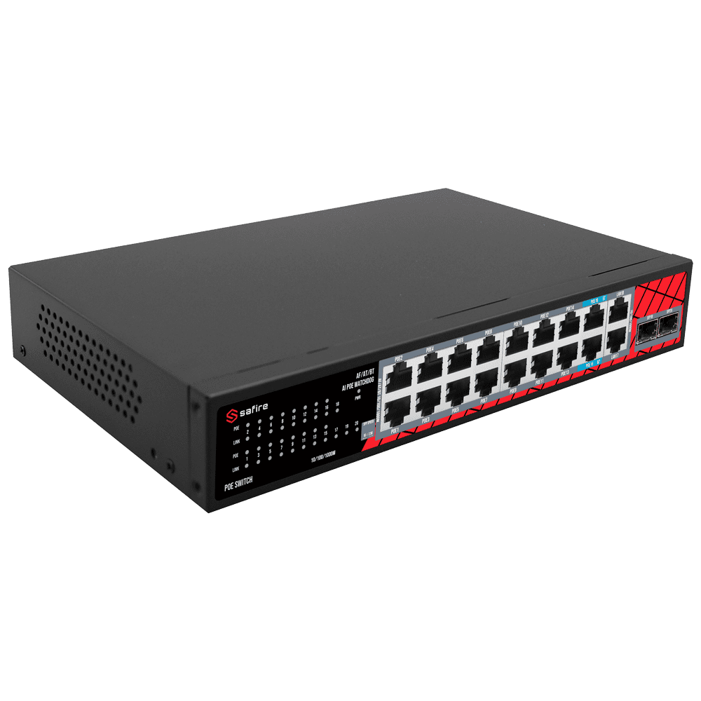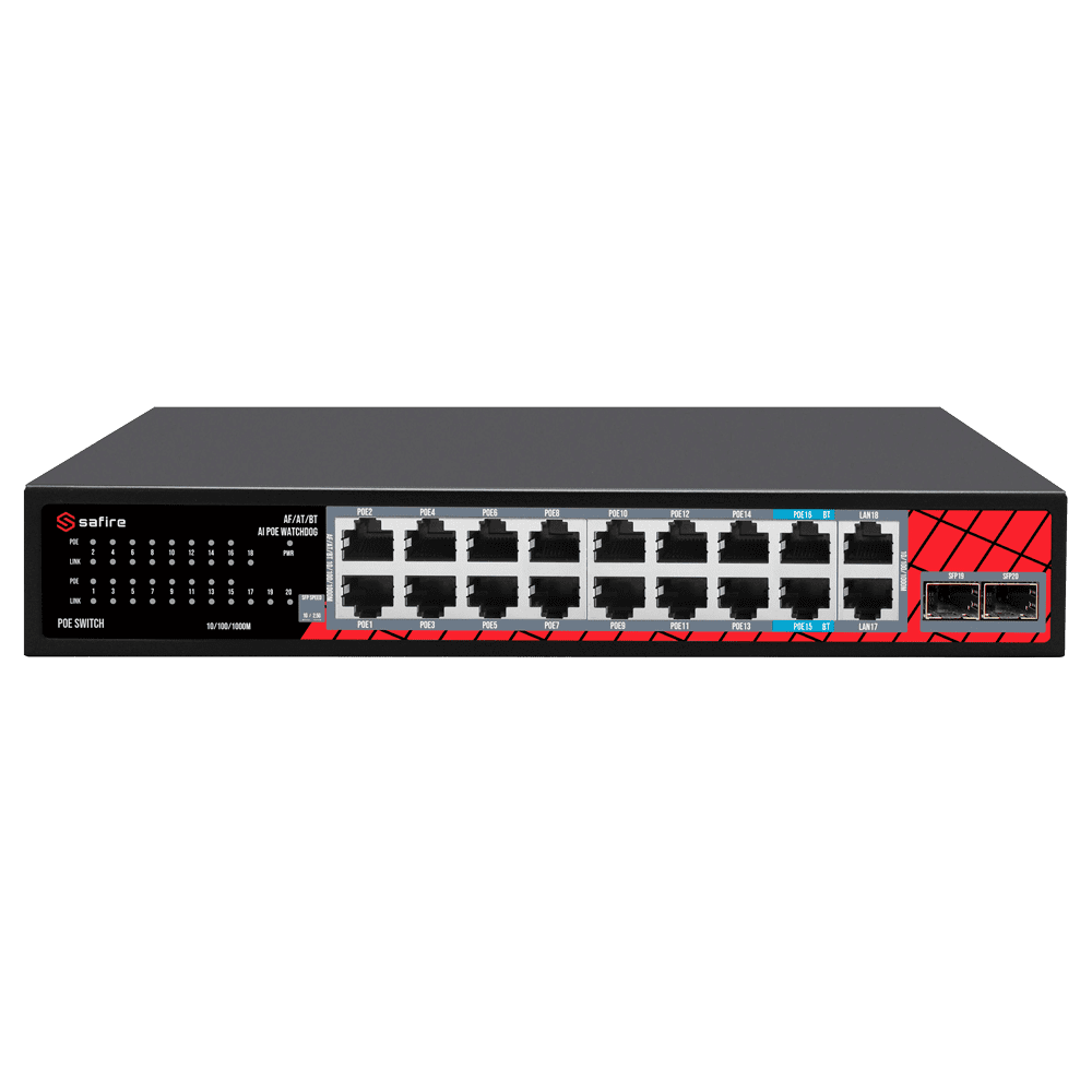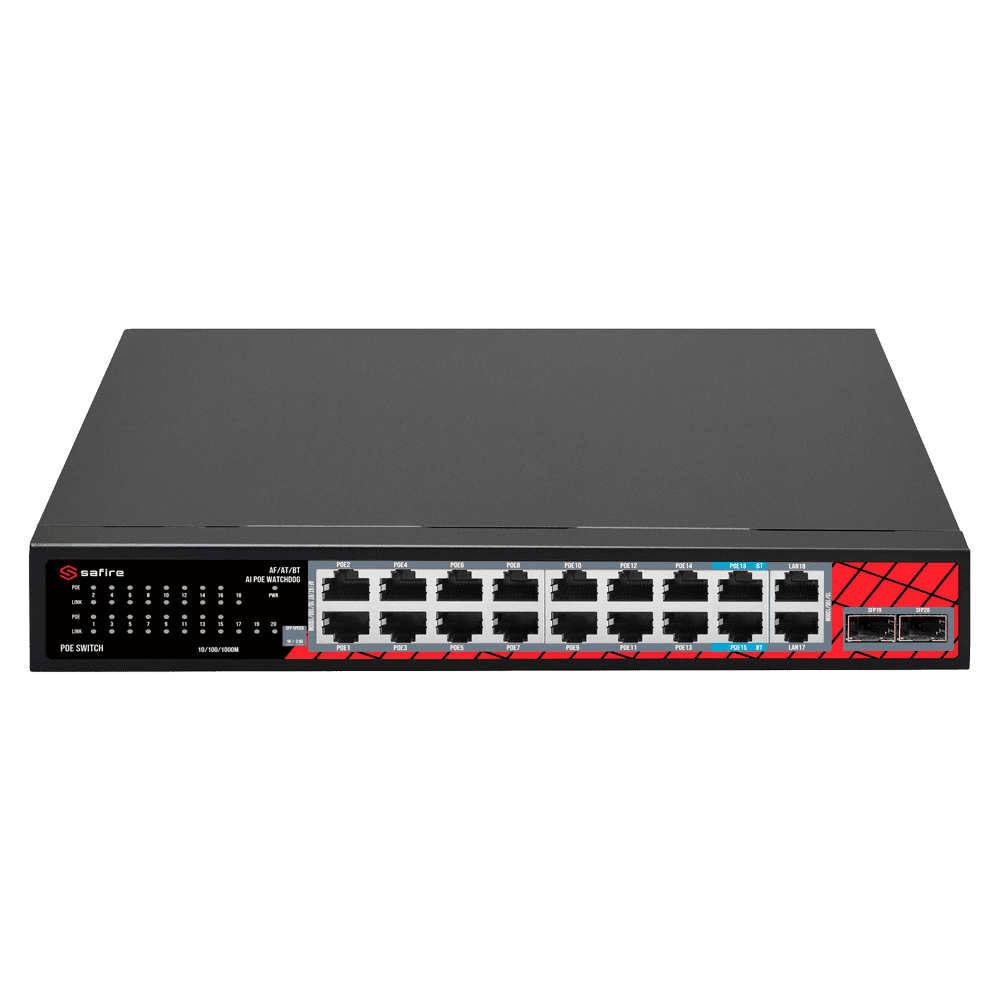 Safire Switch Hi-PoE – 16 Portas PoE + 2 SFP + 2 RJ45 – Velocidade da porta 10/100/1000/2500 Mbps – 14 Portas PoE+ 30W + 2 Portas Hi-PoE 60W – PoE Watchdog – Até 240W Potência PoE total