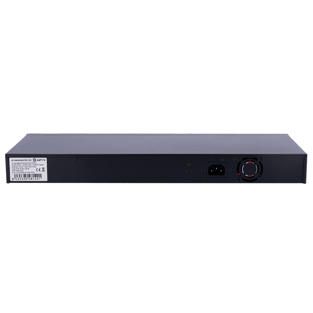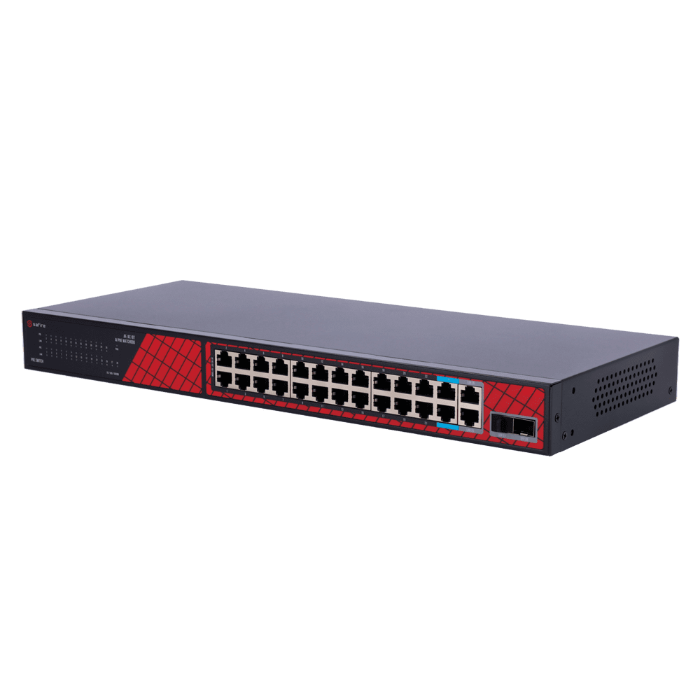 Safire Switch Hi-PoE – 24 portas + 2 SFP Uplink + 2 Uplink RJ45 – Velocidade da porta Fast Ethernet 10/100 Mbps – 22 Portas PoE+ 30W + 2 Portas Hi-PoE 60W – PoE Watchdog – Até 300W Potência PoE total