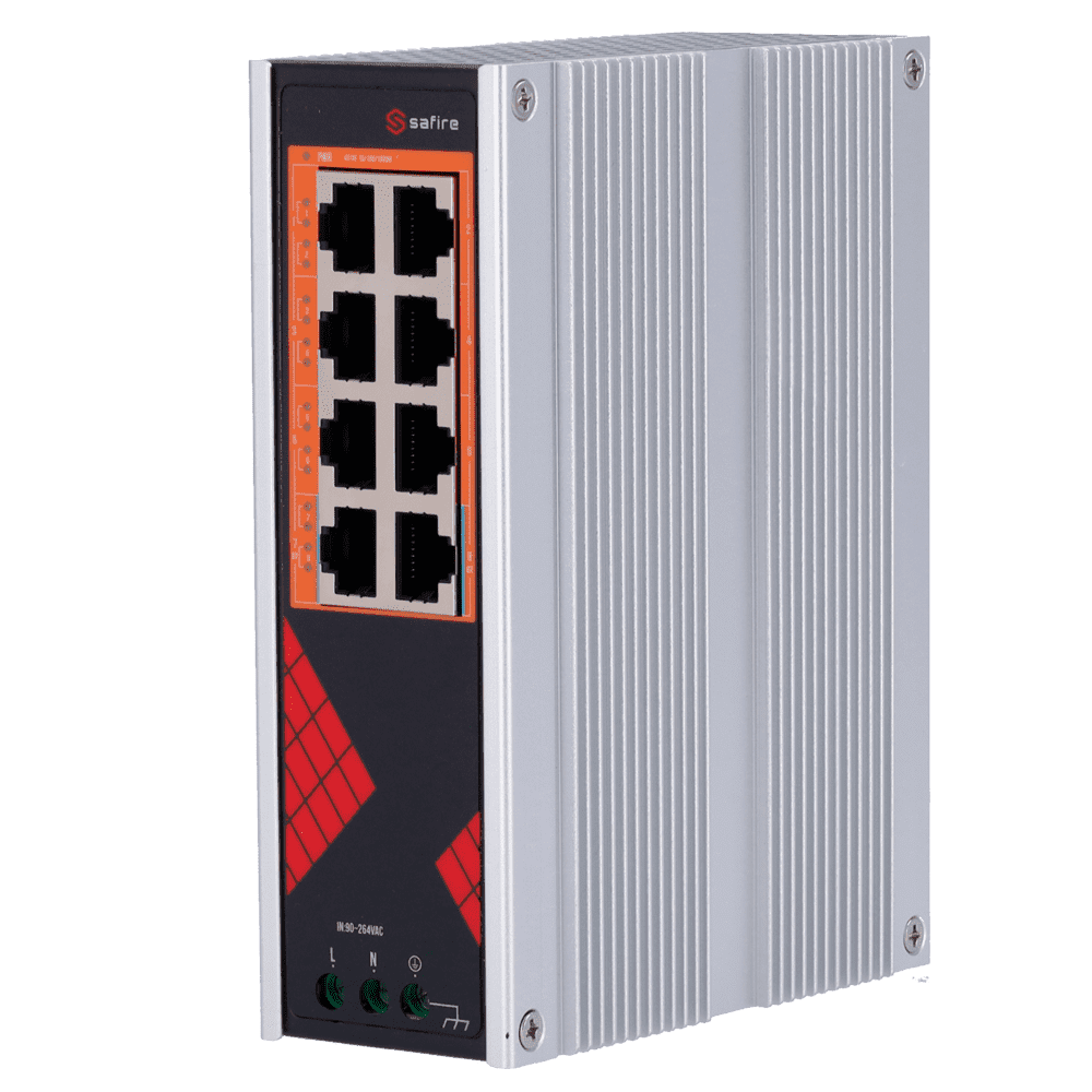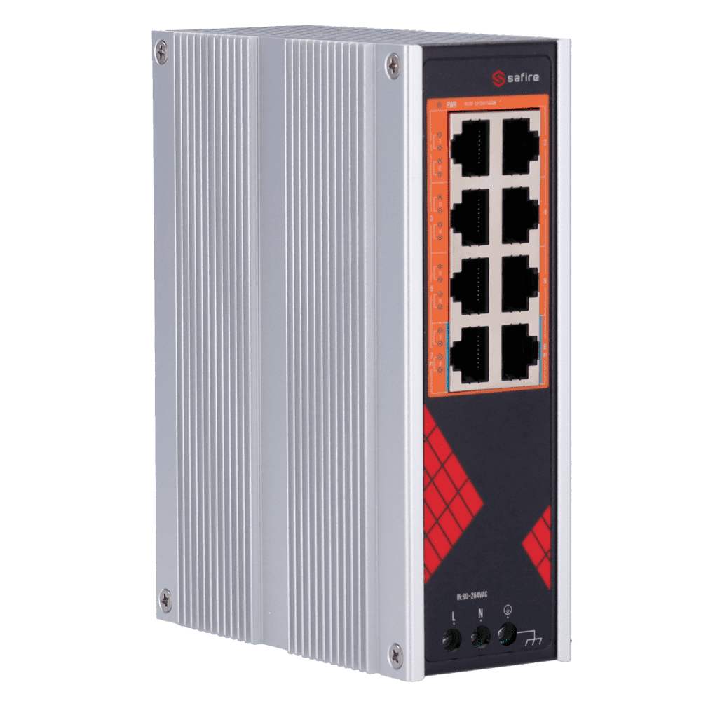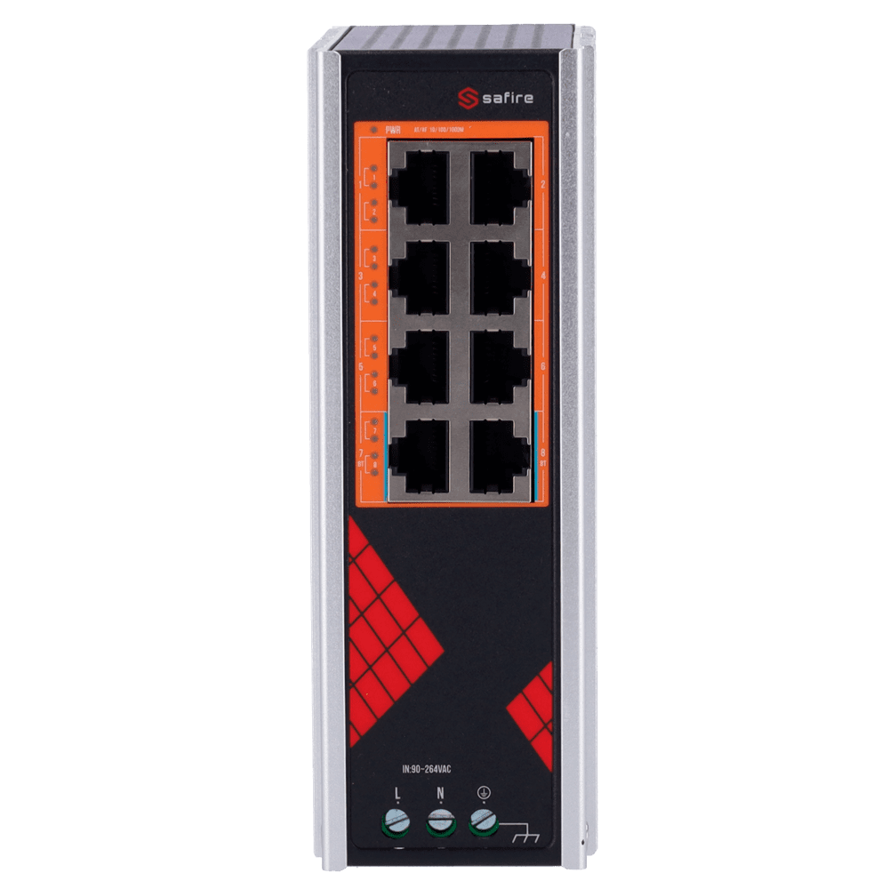 Switch Safire de Alimentação AC industrial 90~264V – 8 porta Gigabit 10/100/1000Mbps – 6 Portas PoE+ 30W + 2 Portas Hi-PoE 60W – PoE Watchdog – Até 130W Potência PoE total – Instalação em calha DIN