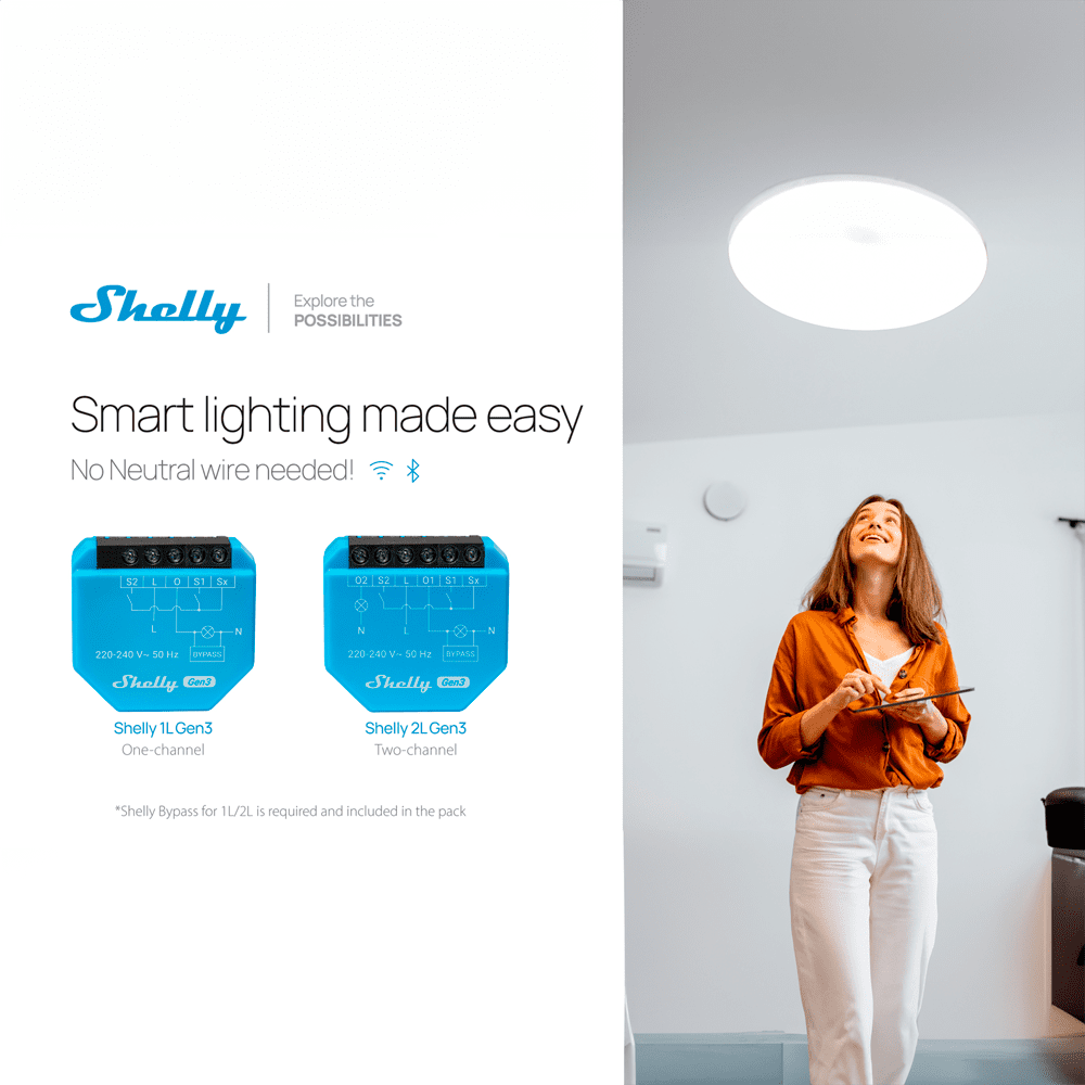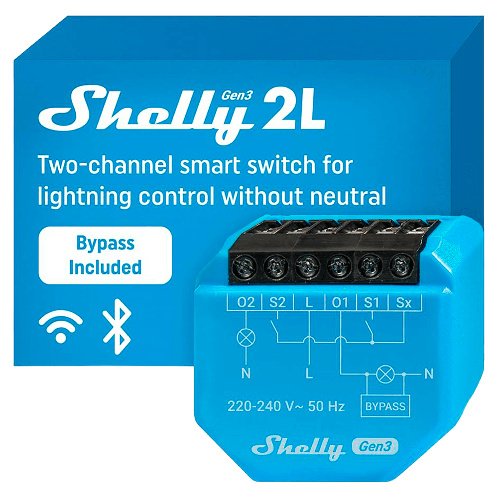 Shelly 2L Gen3 – WiFi 2.4 GHz IEEE802.11 b/g/n / Bluetooth – Interruptor inteligente / Sem neutro – Suporta 220-240 V~50Hz – Bypass 1L/2L – Compatível com Alexa e Google